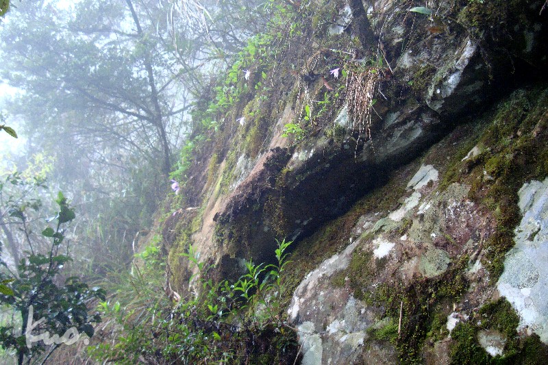 肥嘟嘟特攻隊首領阿山與志修,04/02/2012剛由加里山回來,馬上來報告狀況,一直無法相信那是真的,隔天再遣溫哥偵查,帶回來影像顯示,千真萬確,那是真的,面對光禿禿岩壁,慘到不忍卒睹,上下兩片數百朵一葉蘭,就這樣一夜消失,只剩殘存的崖下一朵(啃完大餅掉在地上的屑屑),全台最壯觀野生一葉蘭,就此拜! 拜!了。