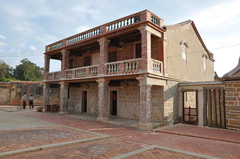 是五腳基的形式,面開三間,是歐陽鍾遠於清朝同治年間下南洋致富,於清末民初匯鉅款回鄉興建.正面為平整式五腳基,背牆則有假脊式山牆,且背牆有兩面交叉的旗幟,旗幟上則有寶鏡和獅頭,兩側窗楣下的浮雕花飾飾紋瑰麗,在金門洋樓群中較少見.
