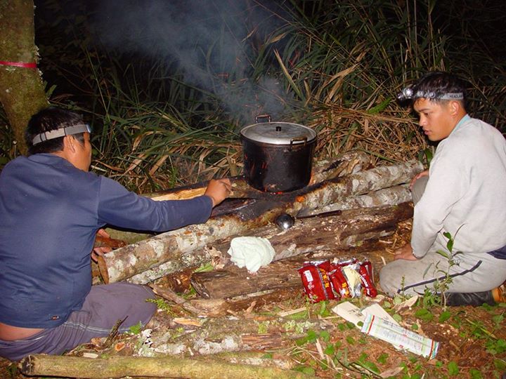 他頭上包著毛巾、額頭帶著tinaqis(頭帶),腳穿塑膠雨鞋、肩上背著「鐵架配米袋」搭湊的登山背包。這是我第一次被林淵源大哥帶入布農族的傳統領域中,也是第一次聽到巡山員這個工作職位名稱,才知道有一群布農族族人在自己的祖居地,為外來旅客、學術團體做嚮導揹工的工作。