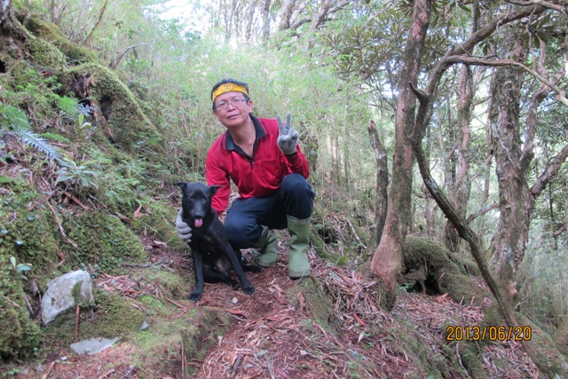 1010 倒木營地(022),H2038m,倒木下的天然的營地遮風又避雨,包覆在箭竹林中;小黑還是跟著,盈