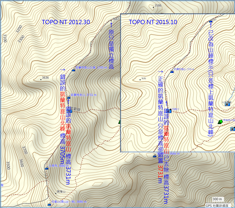 1.其實你若是有經歷 Garmin Taiwan Topo NT等高線電子地形圖的版本變化, 你就可以判斷分析出其端倪, 你所貼是已改正一半的Topo NT(凱蘭特崑山的位置已移動正確, 標高卻由正確3705錯置為不對的3731)...詳看比較圖 → 凱蘭特崑山&凱蘭特崑山北峰garmin.jpg