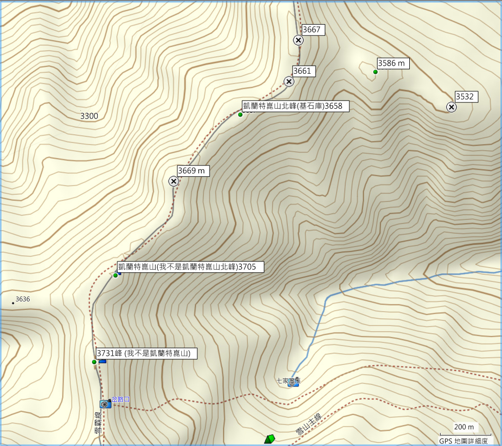 4.某知名山友整理的資料, → 凱蘭特崑山&凱蘭特崑山北峰data.jpg 其中凱蘭特崑山北峰的標高稍有不同為3658m(經建三版是3667m, 上河圖是3661m), 總之位置就是在我標示凱蘭特崑山北峰的地方.
