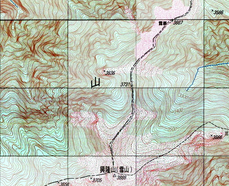 所述與當時的五萬分一地形圖對照後,如圖四,可以清楚地界定,標高3735公尺的山峰為凱蘭特崑山,再往北標高3686公尺的山峰為凱蘭特崑山北峰。八○