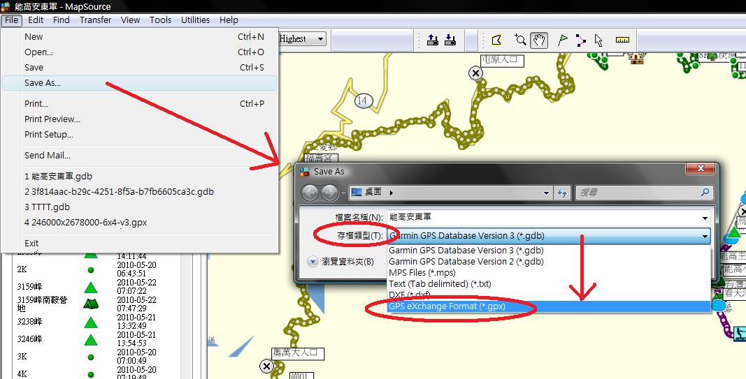 A2:在Garmin的Mapsource軟體中,只要選擇【另存新檔】,再將存檔類型下拉到GPX,點選確定就可以了,如下圖所示範