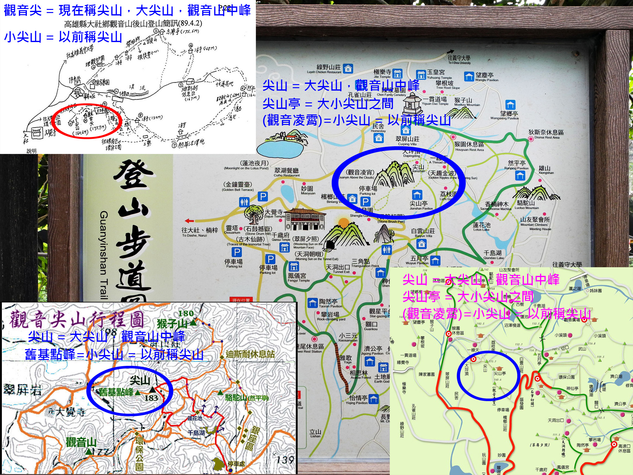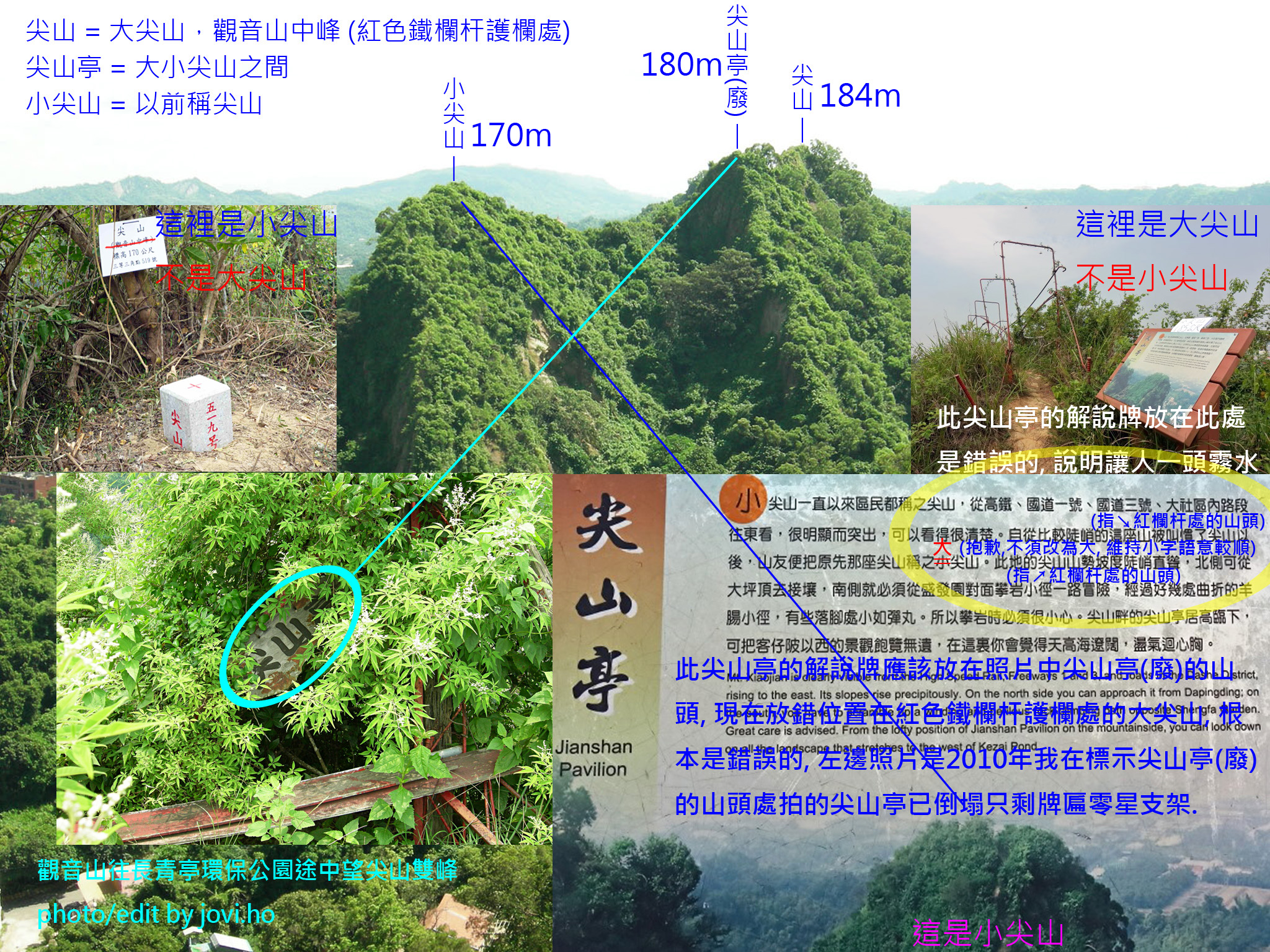 尖山亭解說板是在說,自從把有鐵欄杆護欄的最高處(184公尺)稱為尖山(大尖山)後,原先有基點(遺失)的尖山名稱就被區別成小尖山(170公尺)。