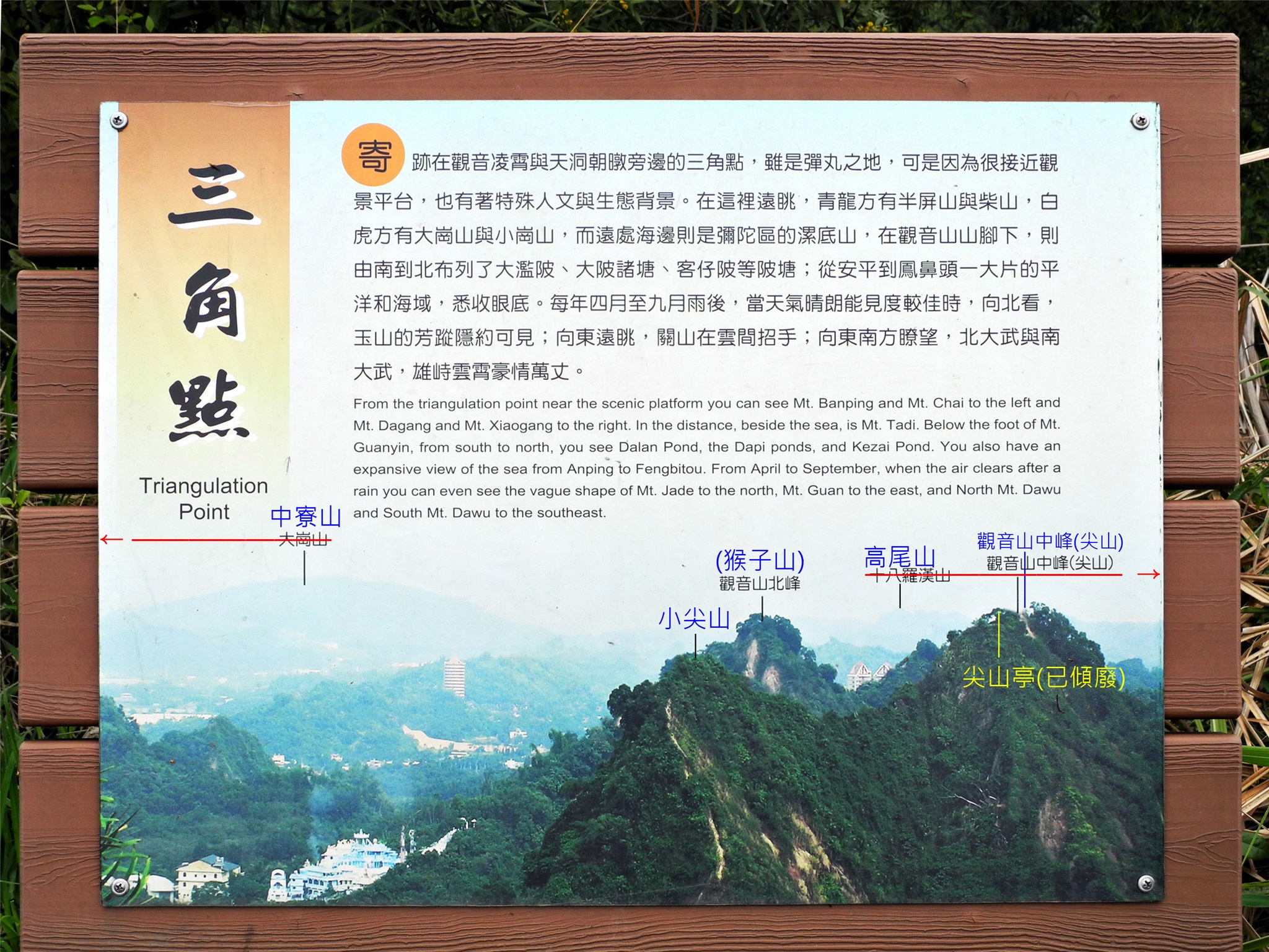 另外觀音山三角點解說板,觀音山中峰(尖山)的山頭是大尖山,不是後稱小尖山的那個尖山,解說板並未標示但有入鏡在照片中央處。