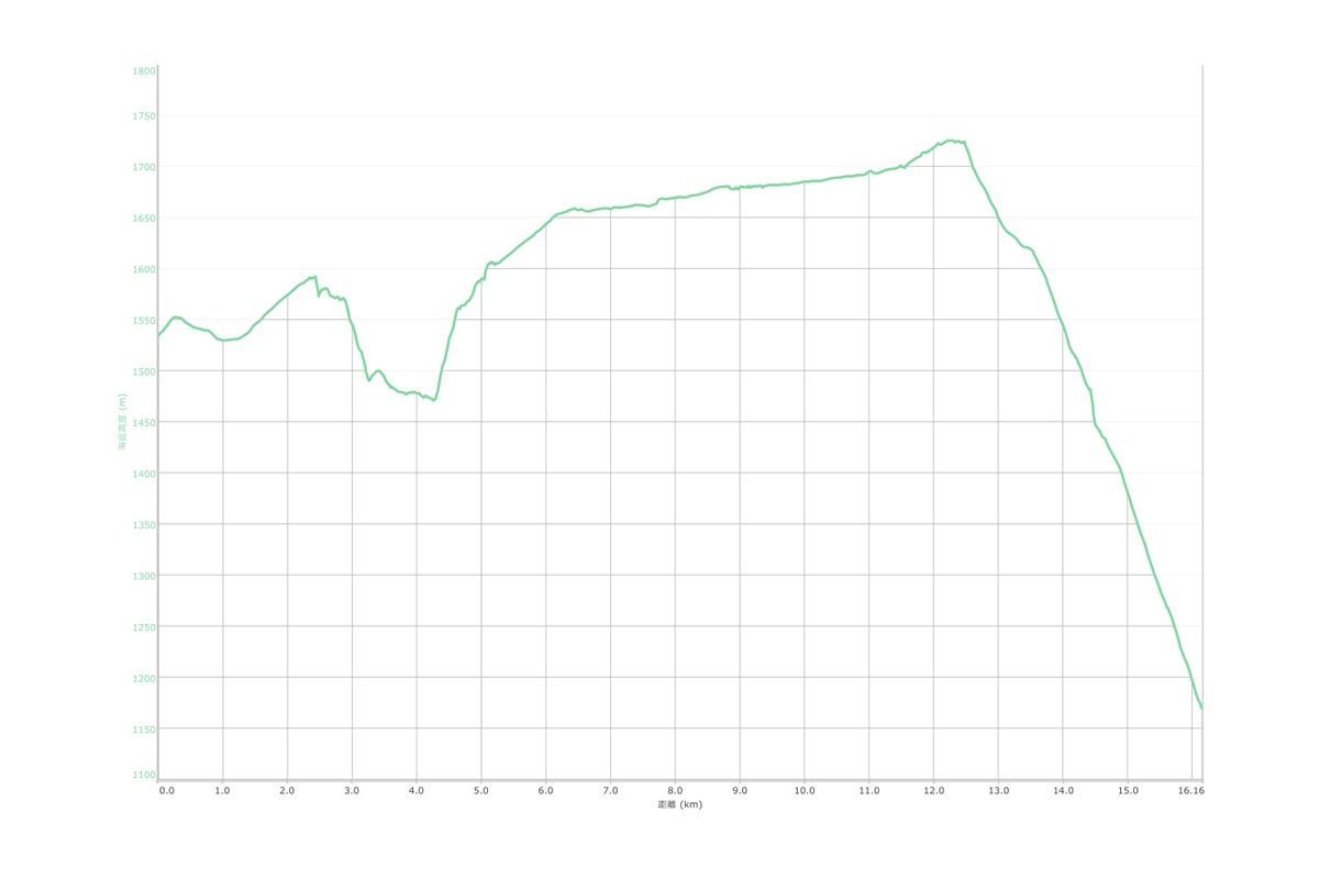 今日總距離 16.2km / 行走+休息用餐時間 8:39 / 上坡總計 391m / 下坡總計 754m / 最高海拔1726m / 最低海拔1170m