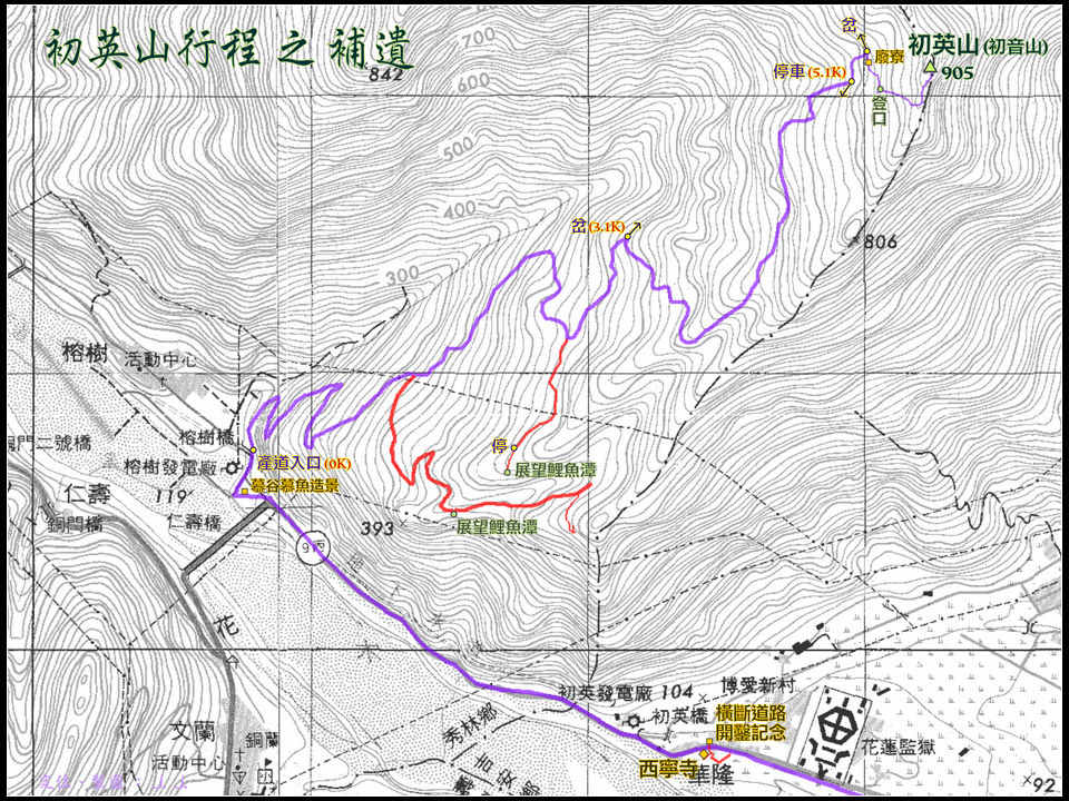 ◎ 相隔約三週後, 再訪初英山的西南稜 (紅線), 主要是尋找可以俯看鯉魚潭的地方, 有兩處不錯的展望點.