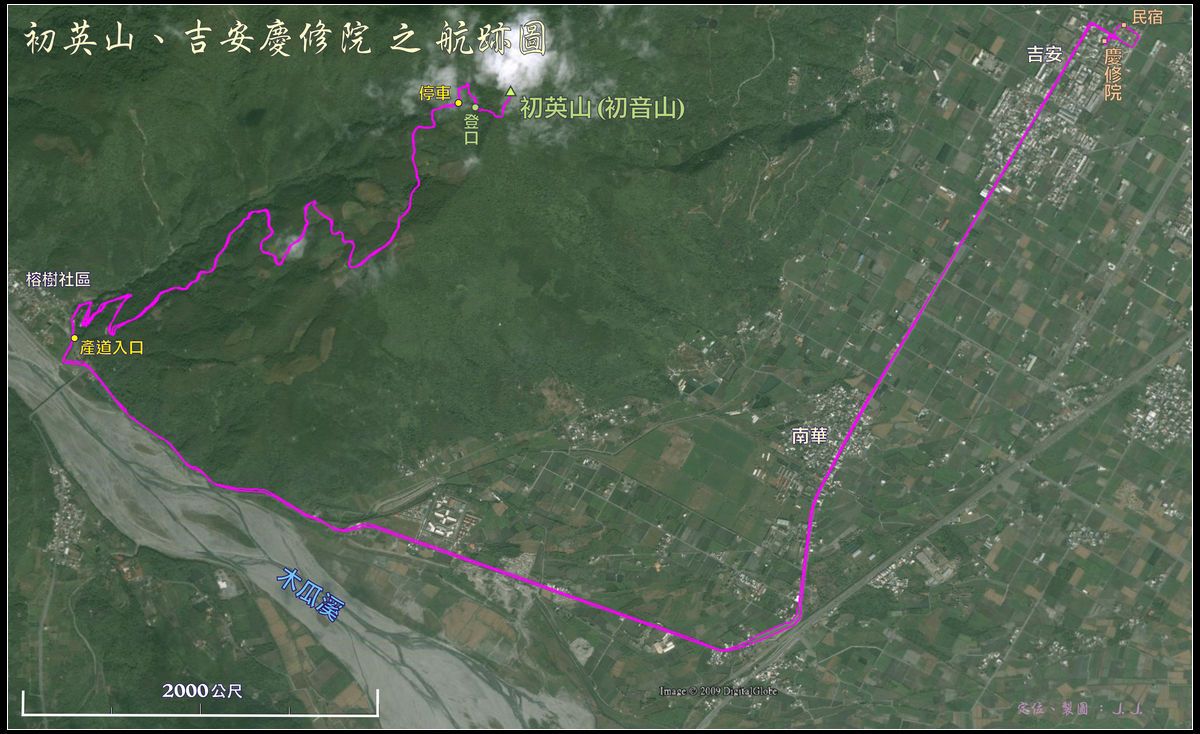 ◎ 還有清晨從民宿到初英山再到吉安慶修院的航跡圖, 底圖摘自 Google Earth .