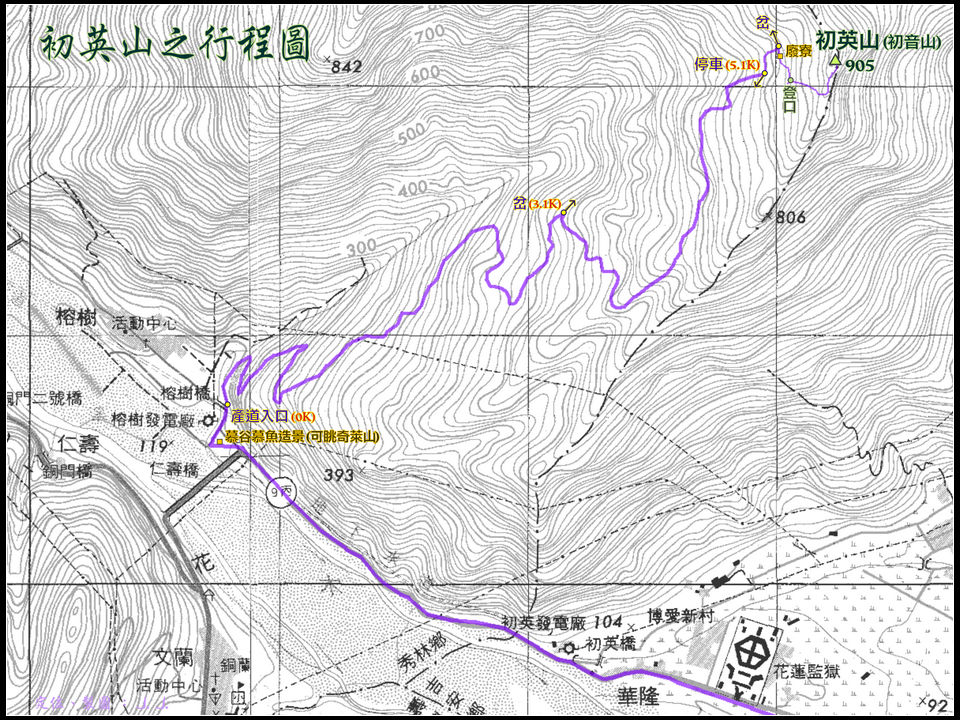另外在產道里程約 1.4K 與 2.6K 處分別有岔路可先到初英山西南稜較低的地方,