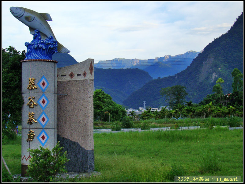 ◎ 離開台 9 丙線將續往榕樹社區前的產道入口, 在「慕谷慕魚」的造景前還可以遠眺奇萊山.