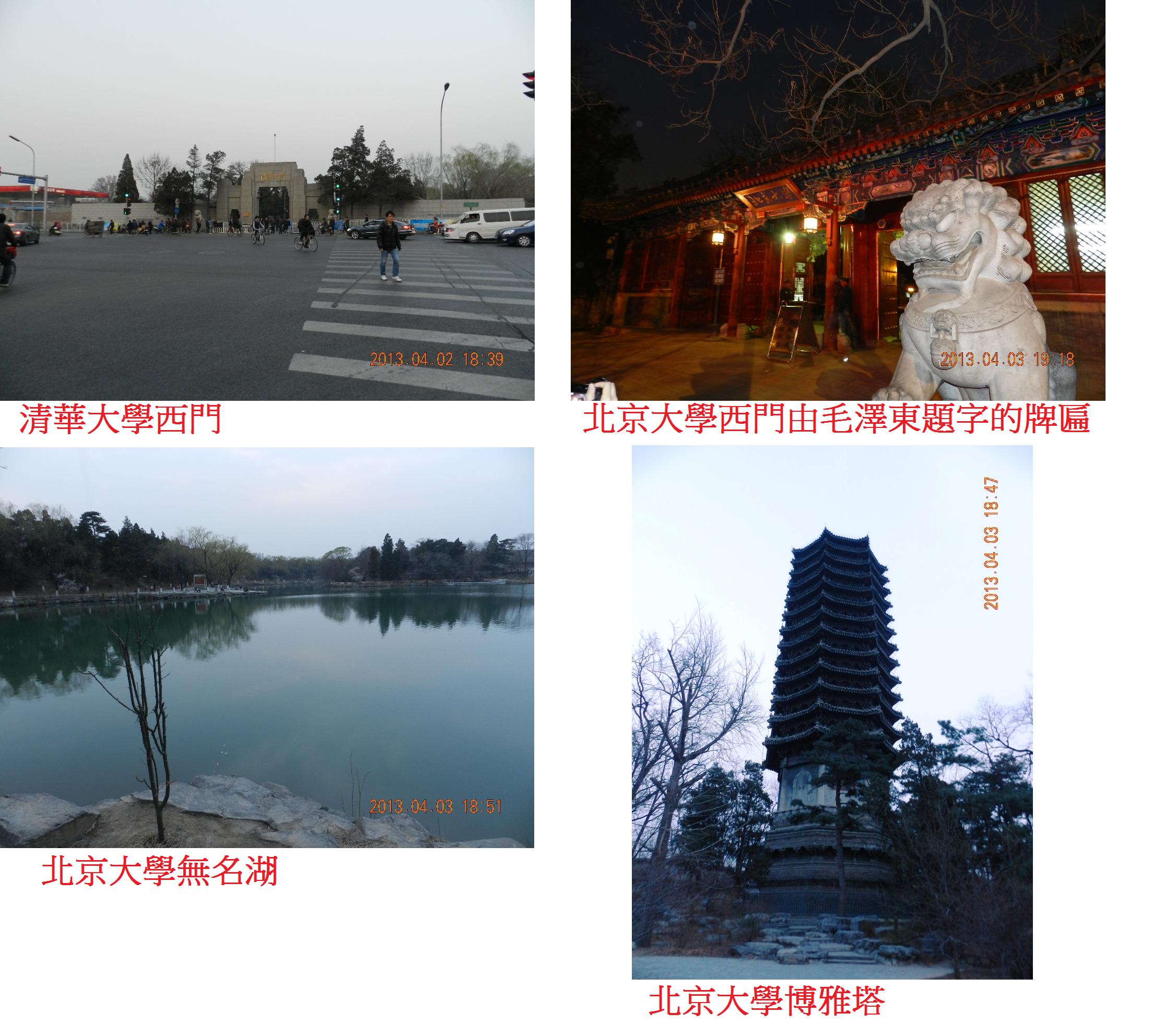 大略看看後由長春園出,本想由清華大學西門進入看看文風鼎盛的名校,卻因時間的關係被檔在門外,只好改由北京大學東門進入最著名的世界名校參觀。北京大學有許多古式建築物及湖光山色的美景,走在校園內感覺不亞于參訪江南園景,學校師生的學習環境還真是好,難怪出了那麼多名人。其中的博雅塔、無名湖、北大西門門楣上由毛澤東題字的北京大學牌匾、北大西門入門後由圓明園及天安門移來的一對華表、及辦公樓前由圓明園移來的一對石麒麟及丹墀,這些是個人覺得一定要拜訪的地方。
