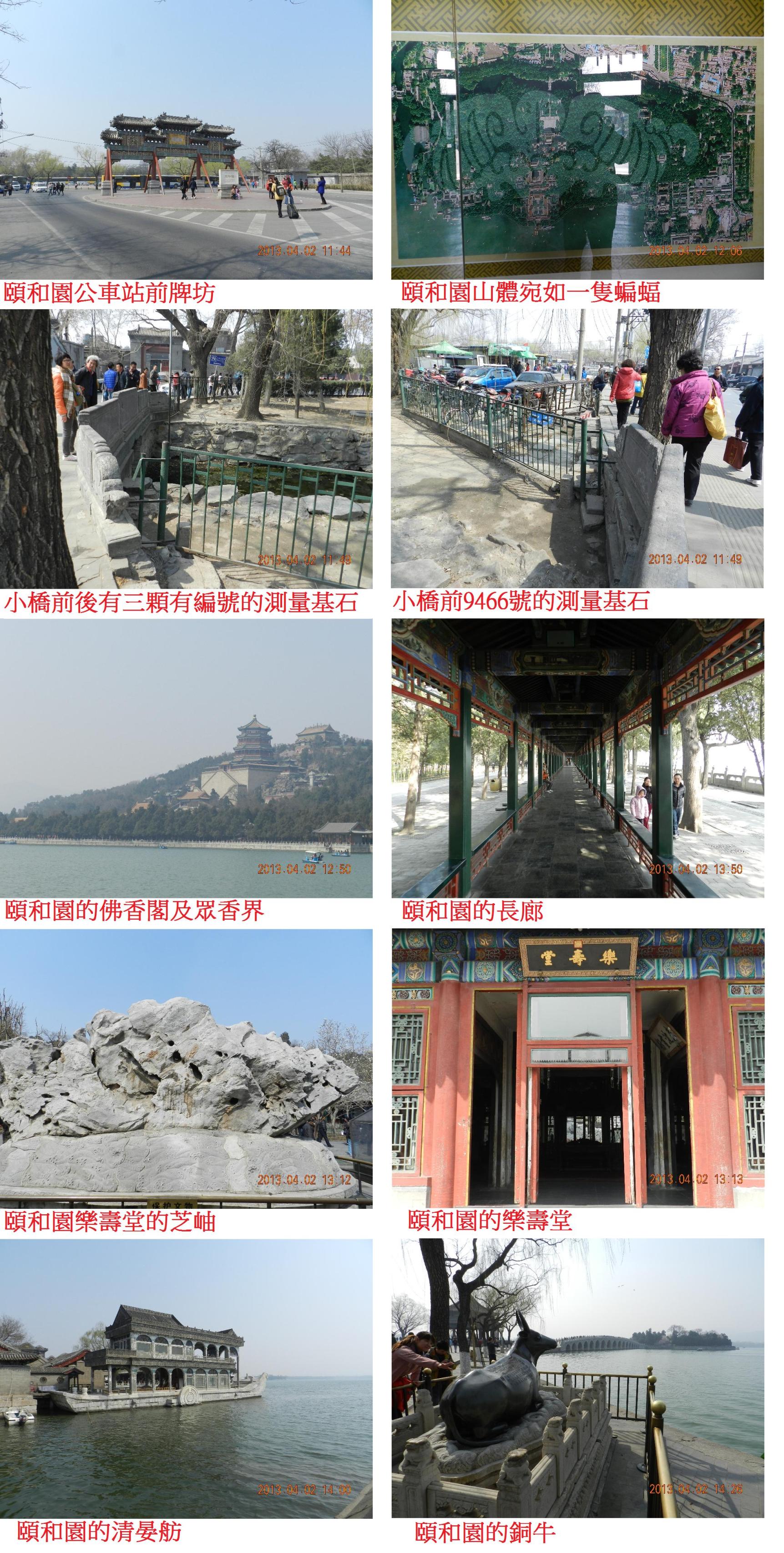 頤和園可搭地鐵或公車抵達,由頤和園公車站往大門走,會經過一條小溪,在小橋前及小橋後的右側鐵欄杆外共有三顆有編號的測量基石,其中小橋前的編號為9466號,小橋後二顆的編號為9467號及9468號,材質為花岡石,大小和形狀跟土地調查局圖根點差不多,作用為何則不知。