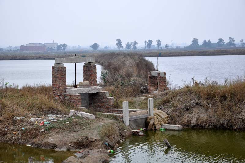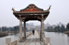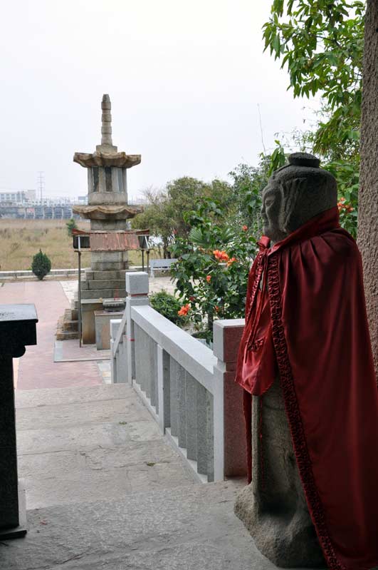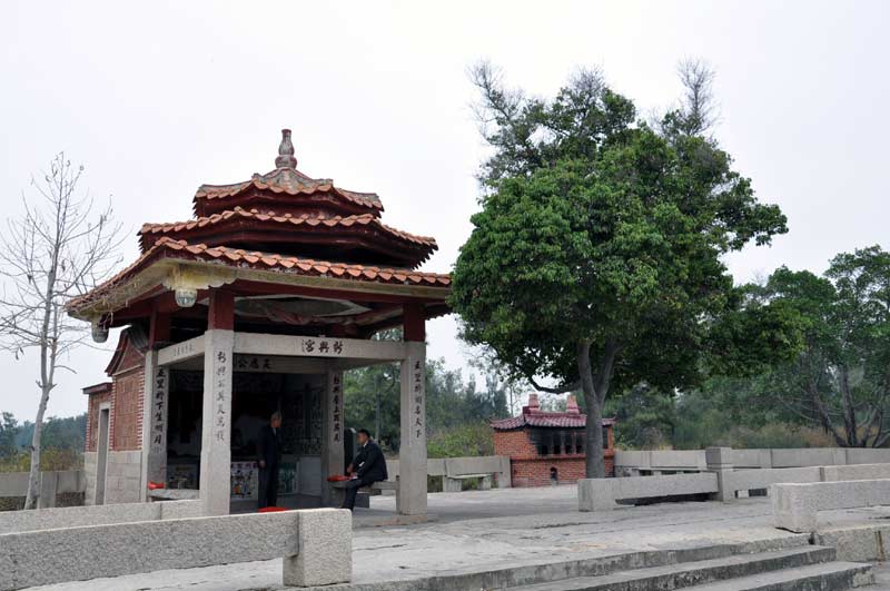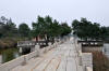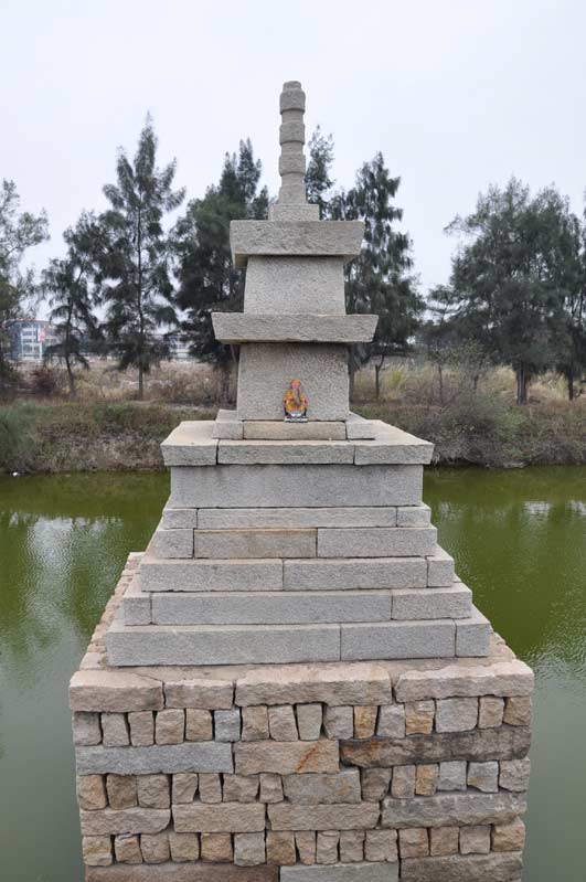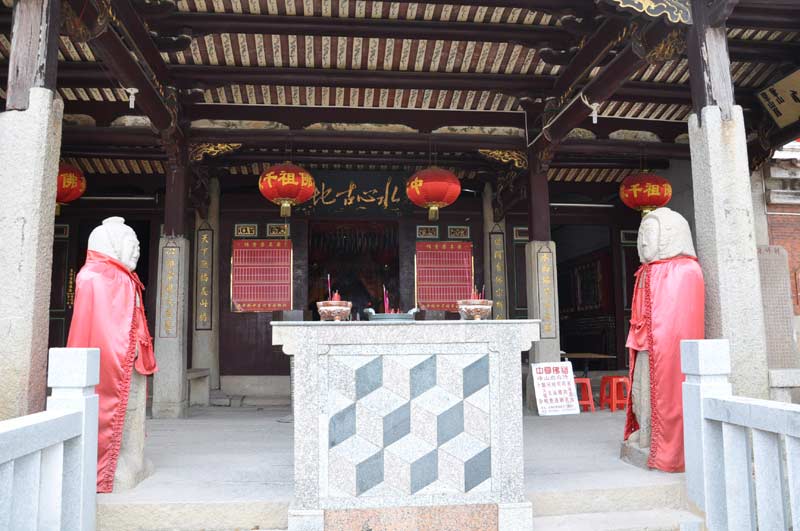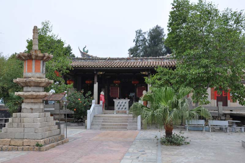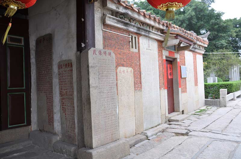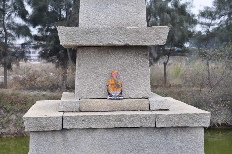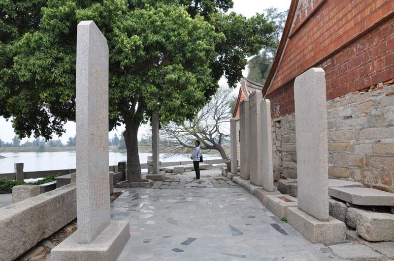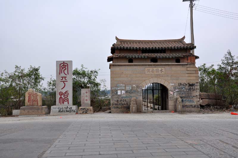 中的一座.水心古地和古寧頭的“雙鯉古地”名字異曲同工,令人玩味.門柱對聯“世間有佛宗斯佛,天下無橋長此橋”,印證安平橋長度曾冠於古代橋梁之首.亭的周圍保存著歷代修橋碑刻十二座,有的鉗入牆壁之中.橋墩有長方形墩、半船形墩和船形墩