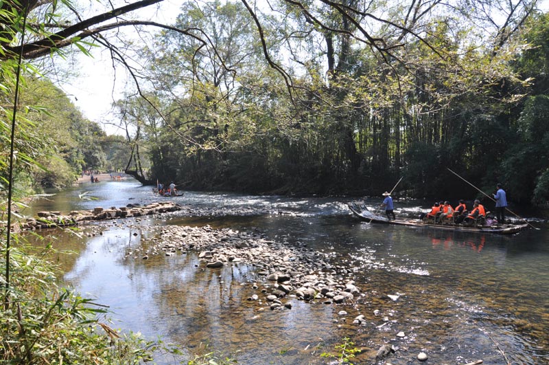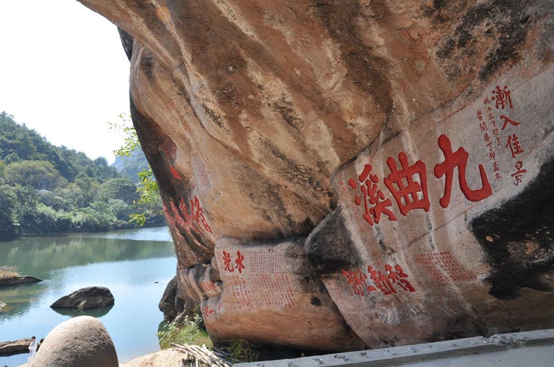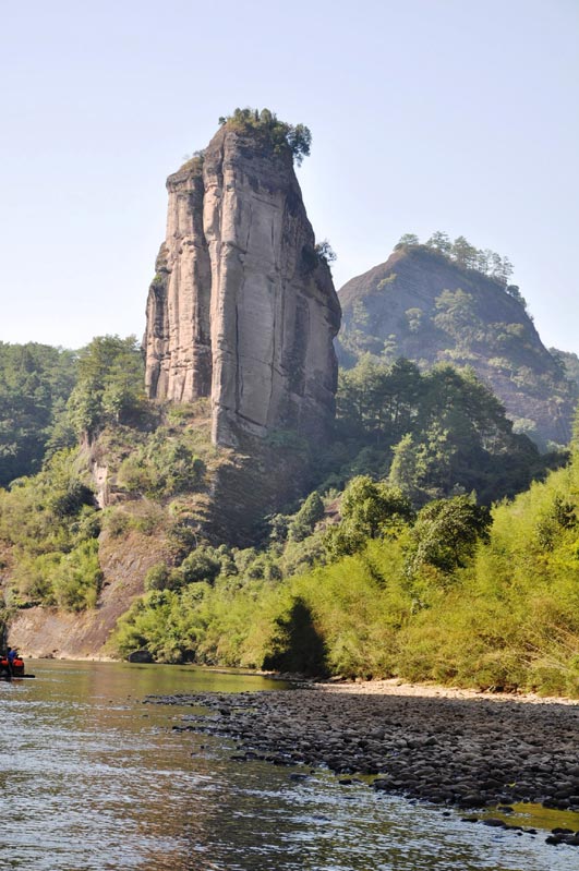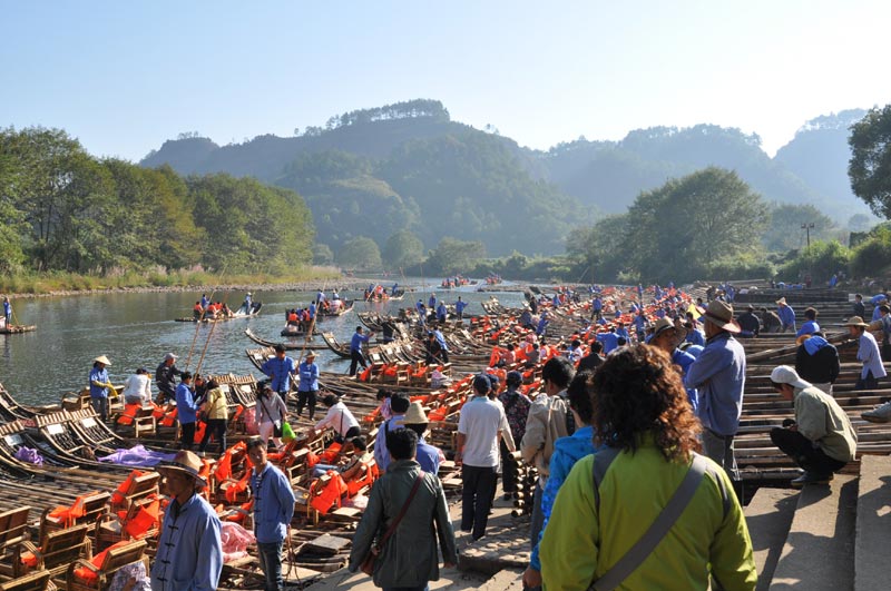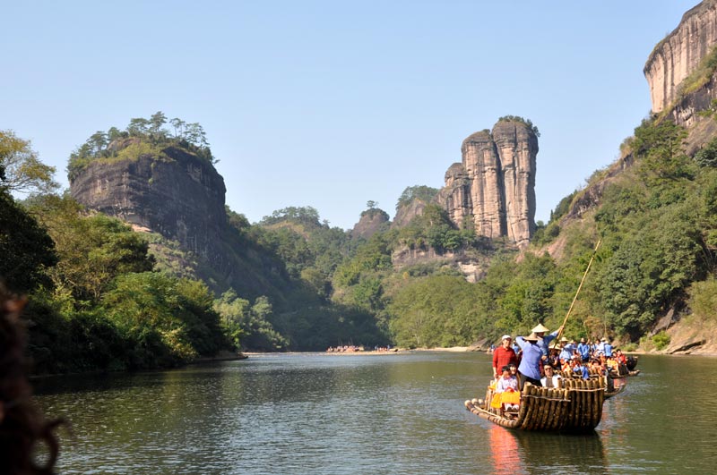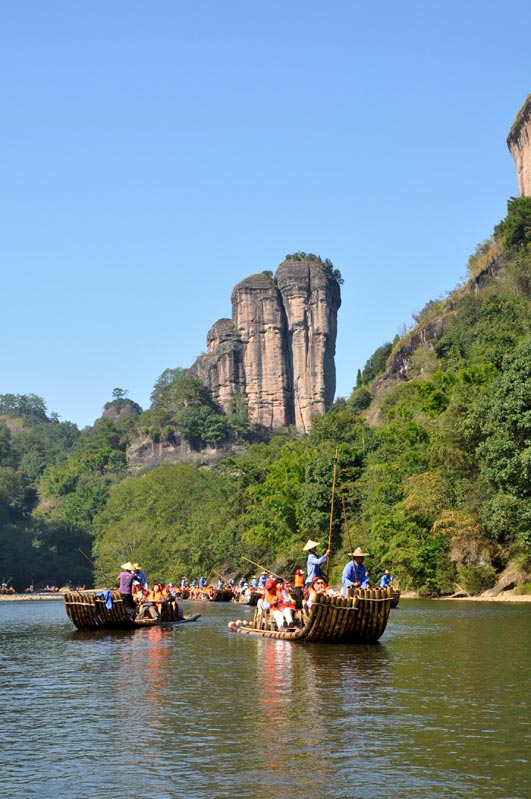 九曲溪漂流則是到武夷山遊客必遊行程,可坐公交到星村下船,沿九曲溪漂流到三姑武夷宮附近上岸,全程約九公里半,船行70分鐘,票價100人民幣,六人一筏,不到六人則不開船.上船後通常會給竹筏撐手小費,每人約5元即可,有的撐船的會強索一人十元,六個人共六十元,不給則擺臭臉,非常霸道.九曲溪漂流會經過天遊峰下,由下往上看感覺平平,但到玉女峰則很有看頭,若到武夷山,建議還是去漂流一下.