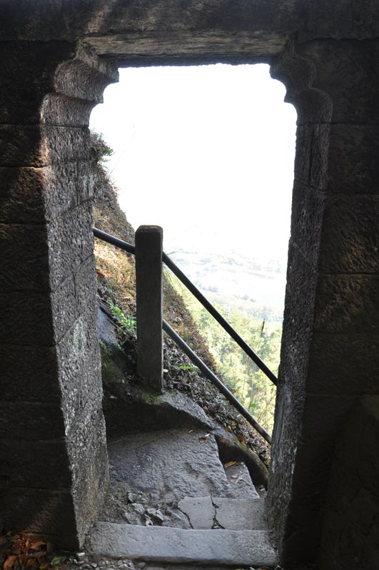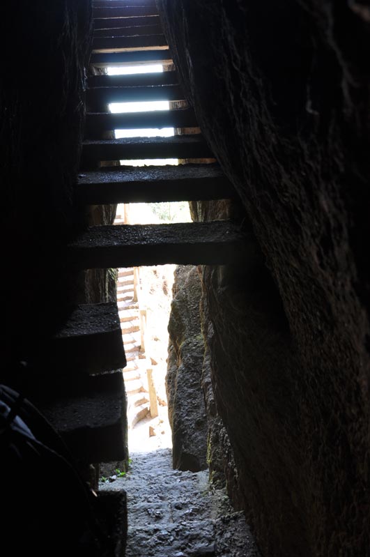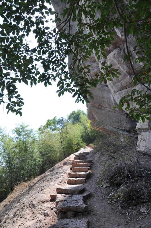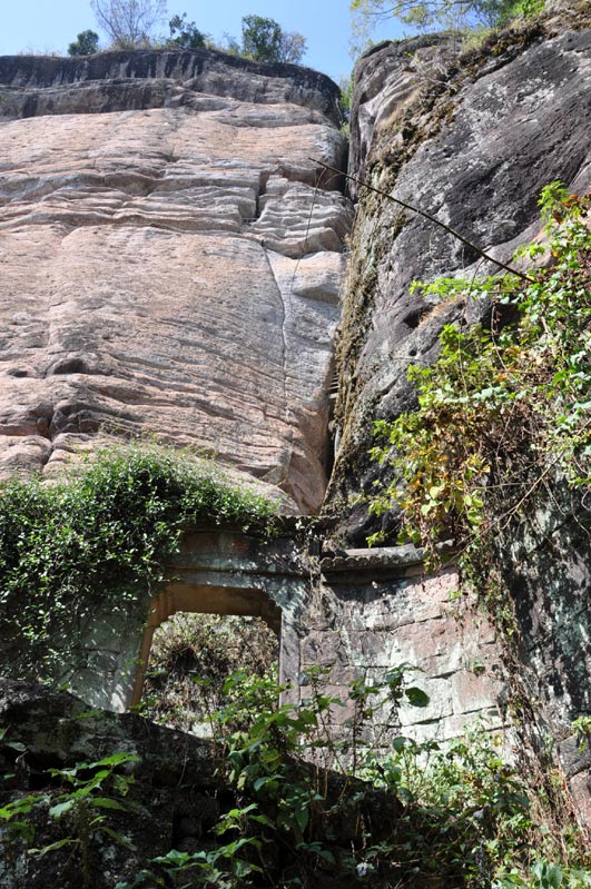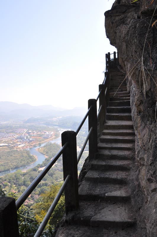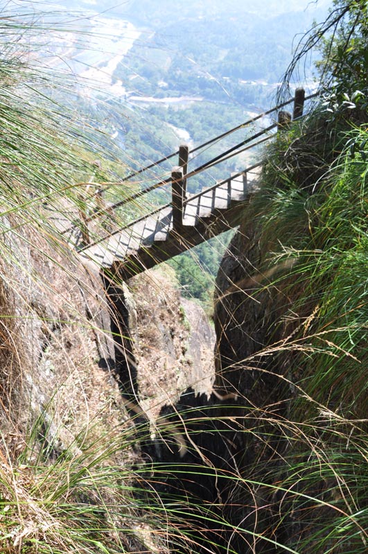 這條裂罅寬僅一尺,中鑿石階或置水泥皮當階梯,往往需要側身縮腹、手足並用才能通過.山頂上還有一條深不可測的岩罅,深不可測,就叫做投龍洞,有水泥拱橋橫跨而過就到了大王峰頂.峰頂則平整得很,林木參天,跟一般山頭沒啥兩樣.原則上建議由北上南下,會比較好走.