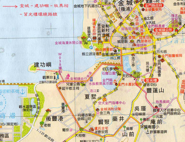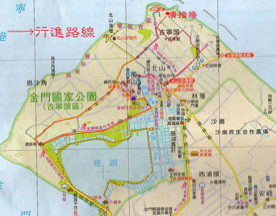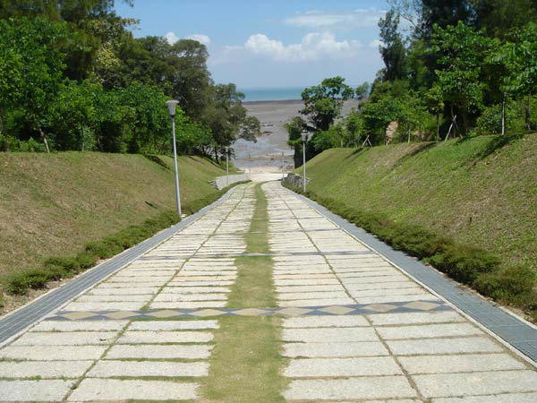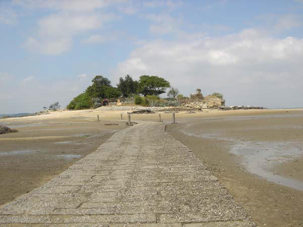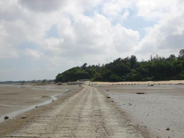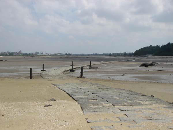 順著延平郡王祠往海邊走,滿潮時是海濤洶湧,退潮時卻出現一條筆直的水泥道直通對岸的建功嶼,全長不到半公里,卻是金門唯一可以踏浪的運補道路,目前島上國軍己撤守,留下的迷彩碉堡成了最佳的眺望點,好像對岸的小金門一摸就可以到似的,不知情的還把它當廈門呢.到建功嶼踏浪必需算準退潮時間,尤其切忌在漲潮前過去,否則你就有得等咧.
