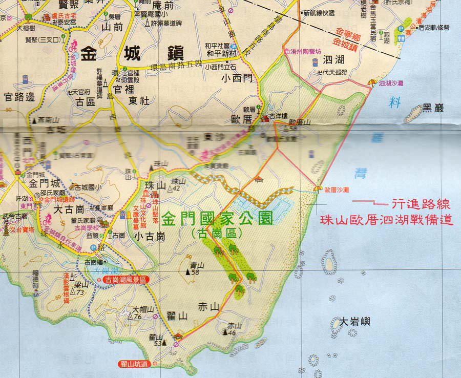 這條車道需由水頭黃添祿宅旁進入會比較順手,途經舊金門城聚落的西門’南門,再順著舊酒廠圍牆邊南進,經文台寶塔’古崗湖接翟山,沿途支線錯綜複雜,但皆可通達平靜秀麗的西南海岸.西線無戰事,雖然先前一樣駐有重兵,但是屬於較安寧的海線,也是翟山坑道擇址於此的原因.