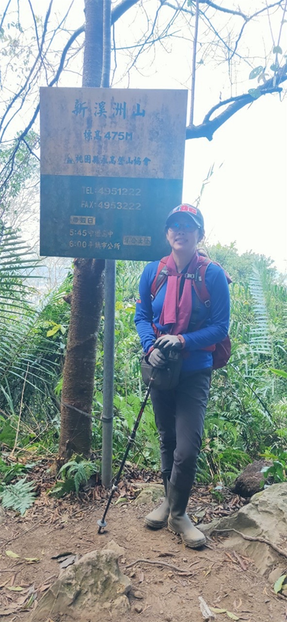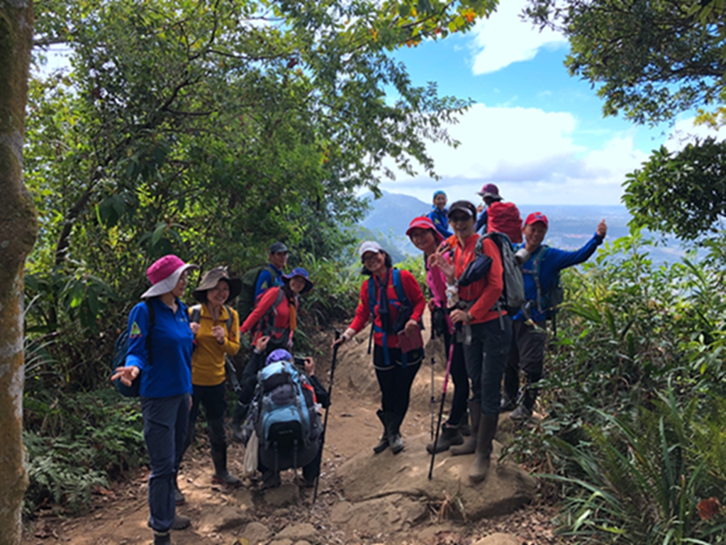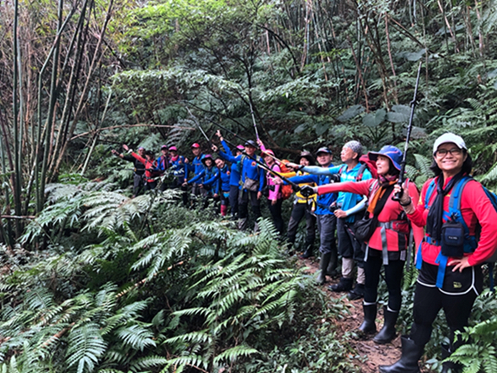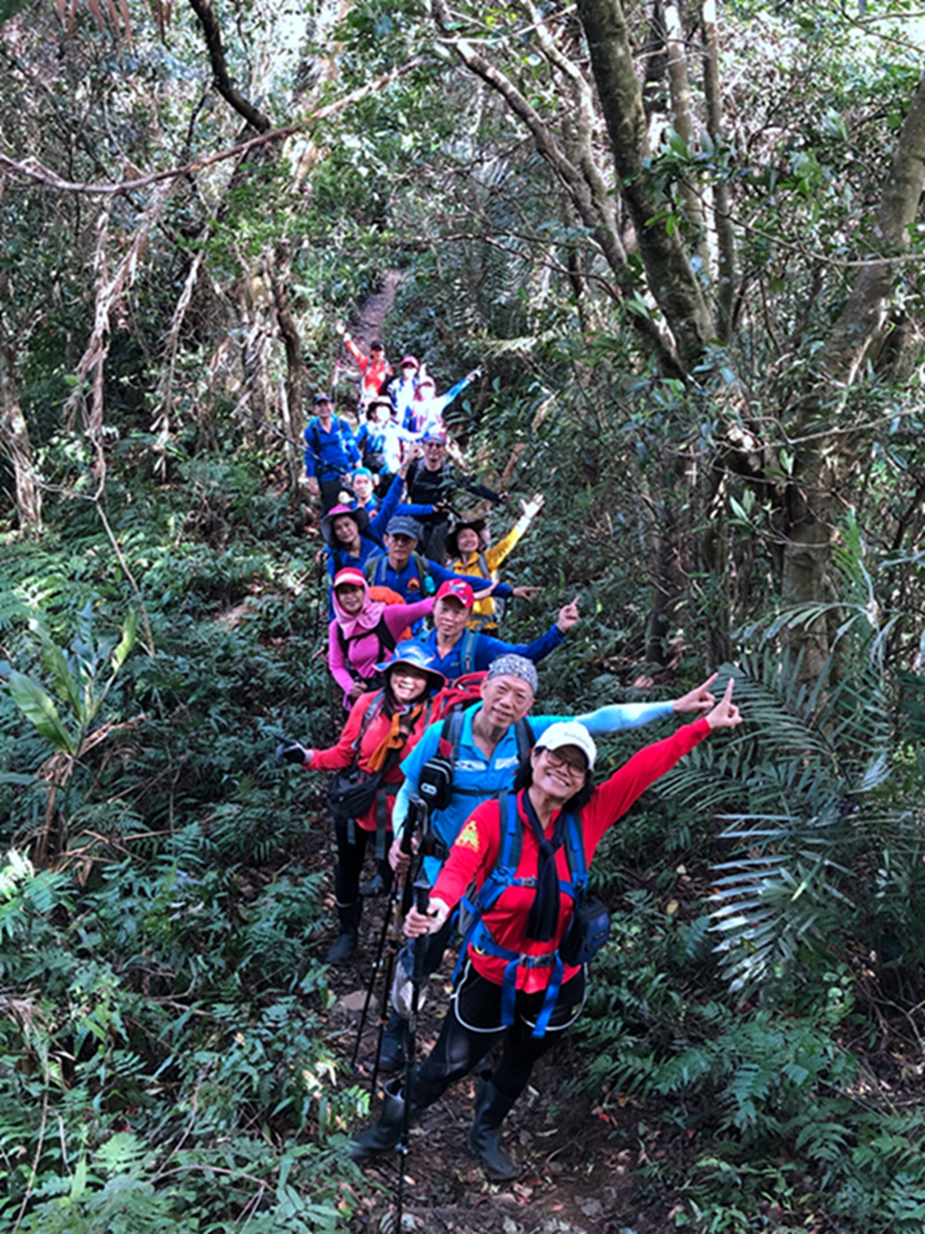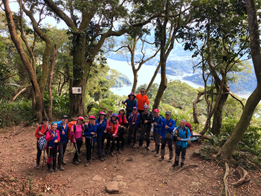 14:52溪洲公園岔(018),H352 m ,循稜線步道下行,沿途可欣賞石門水庫風光;岔路往右可接上溪州石板步道往溪州公園,直行往石門水庫遊客中心;每遇岔路都要等全員到齊再走,免得有人走丟了,這是我的堅持。