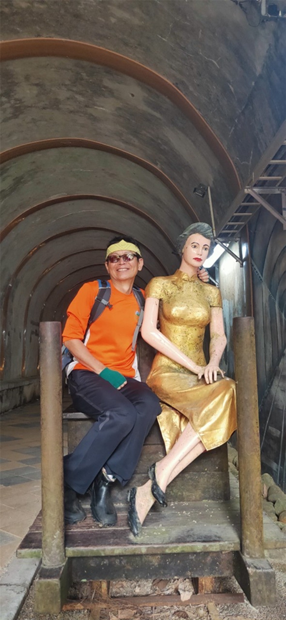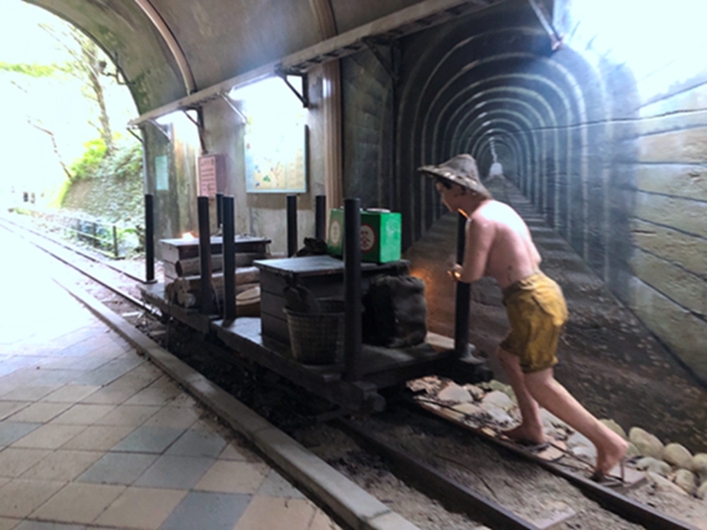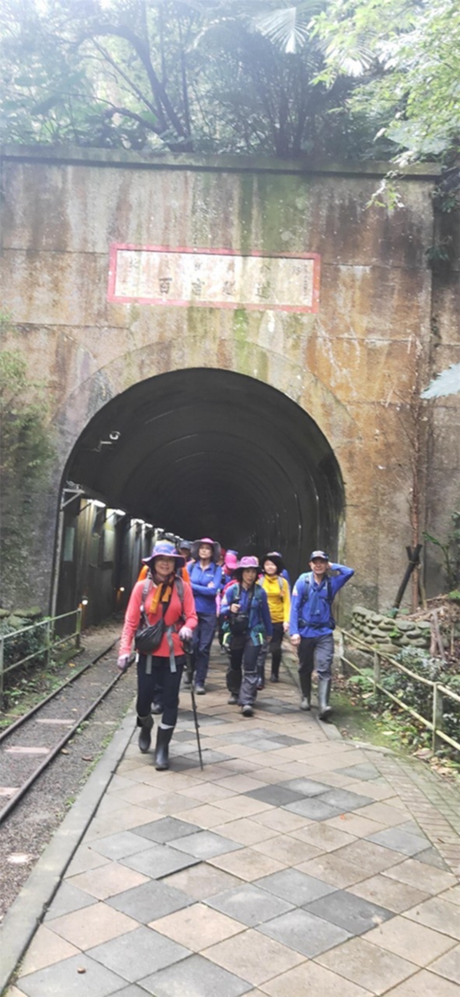 10:00總督府古道登山口(002),H272 m,穿過舊百吉隧道從南口到北口約350公尺,隧道裡右側現仍有台車軌道鋪設,這是日據時期聯絡角板山和大溪的交通要道,現已成為重現往年車伕在輕便鐵道上,手押台車辛苦載客載貨場景的歷史廊道;登山口旁有廁所,上完廁所循木棧階梯而上,進入原始山徑之中。