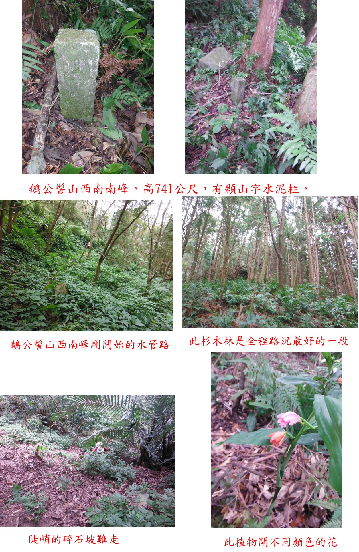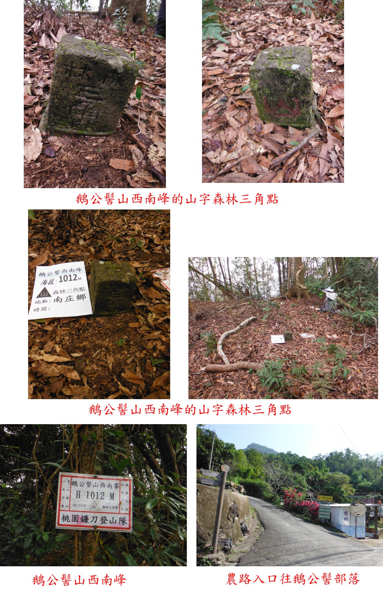 2、鵝公髻山西南峰:位於苗栗南庄鄉,標高1012公尺,森林三角點。