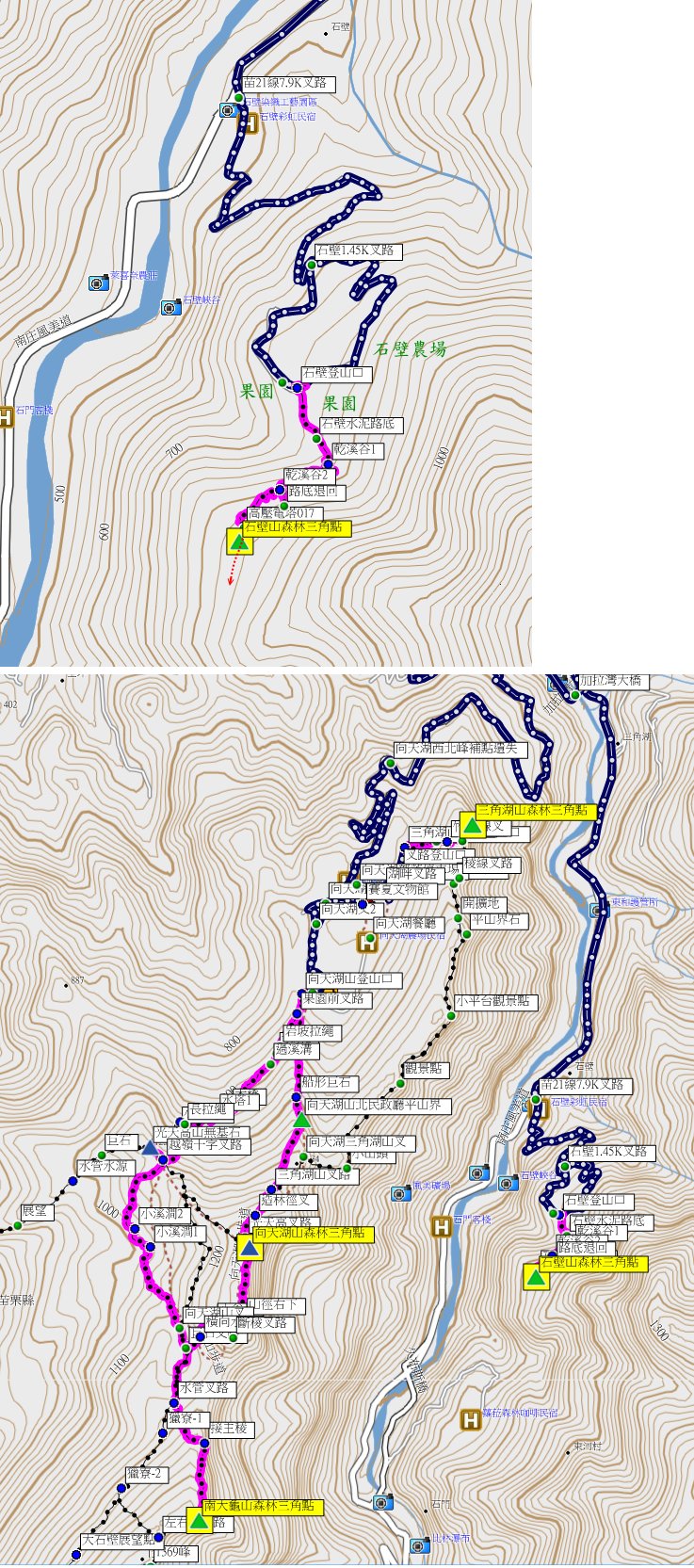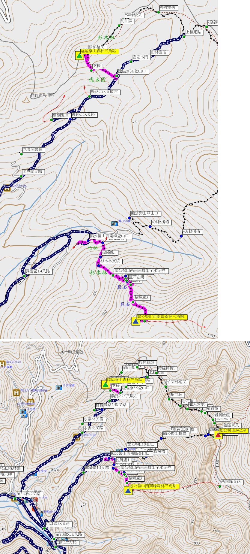 ◎今日此三座山本計畫大半天就可完成,應還有時間去補還幾此都漏掉的用心山,沒料到鵝公髻山西南峰難度高耗時太久,已無時間前往;早早收兵北返。