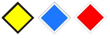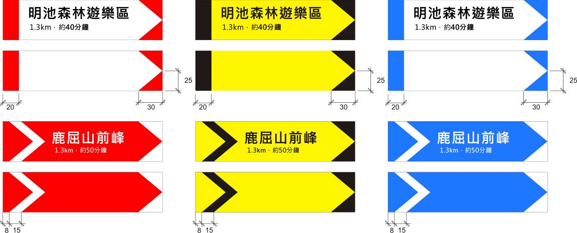 必須在山徑中具強烈識別度,為了與自然顏色呈現對比,參考現有的布條、指標牌、山友穿著之登山服裝顏色,採用紅色、黃色或藍色系。且搭配0.8公分之白邊、黑邊使色塊更明顯。