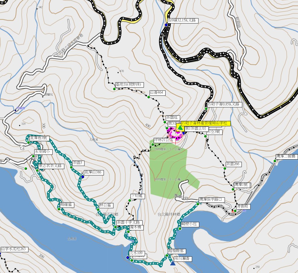 在家躲疫情將大台北地區漏掉的山字水泥柱整理一下,早上出門運動來到坪林地區補2顆遺漏的基點;第1顆為石硿子崙的林產管理局山字柱,位於坪林灣潭地區,由台9線32.15K轉產道走約1.1K,基石就在路上方