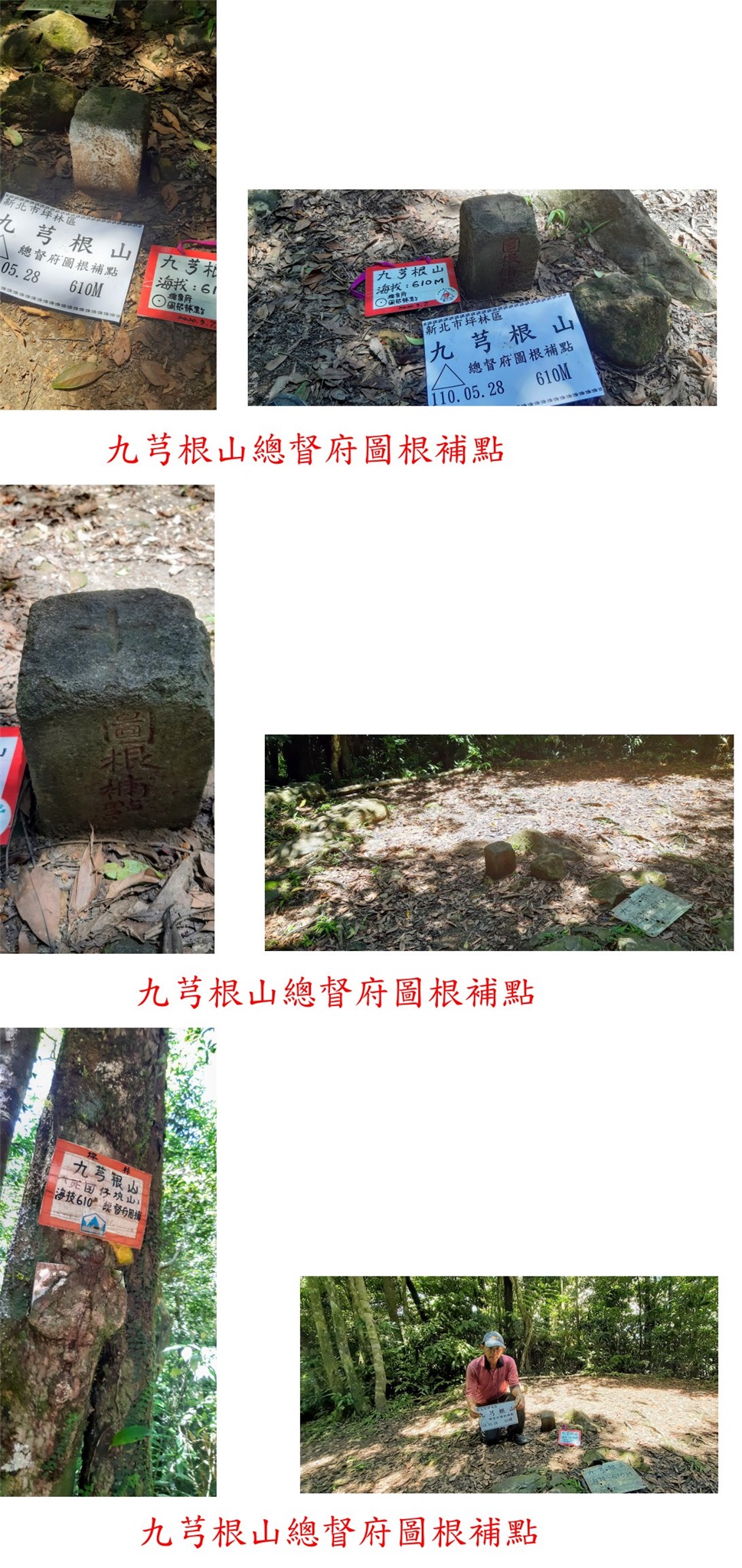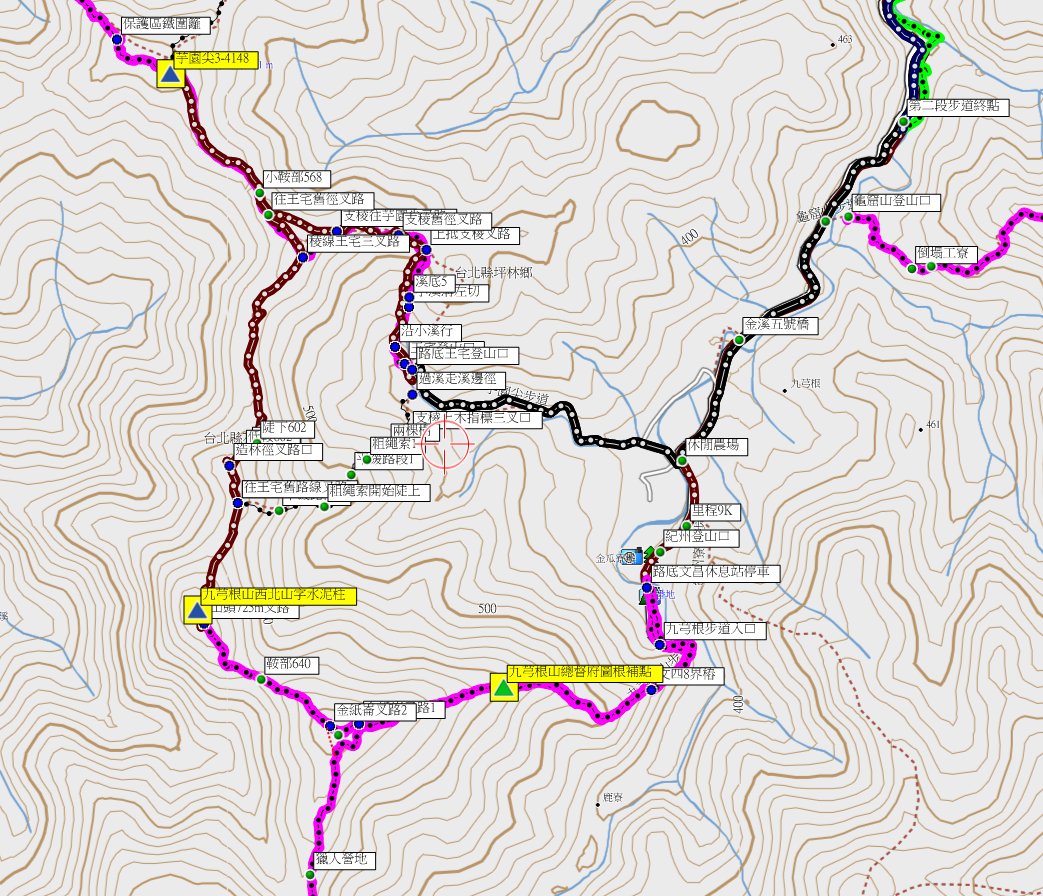 2、九芎根山:位於新北市坪林區,標高610公尺,總督府圖根補點;座標315811 2752660。