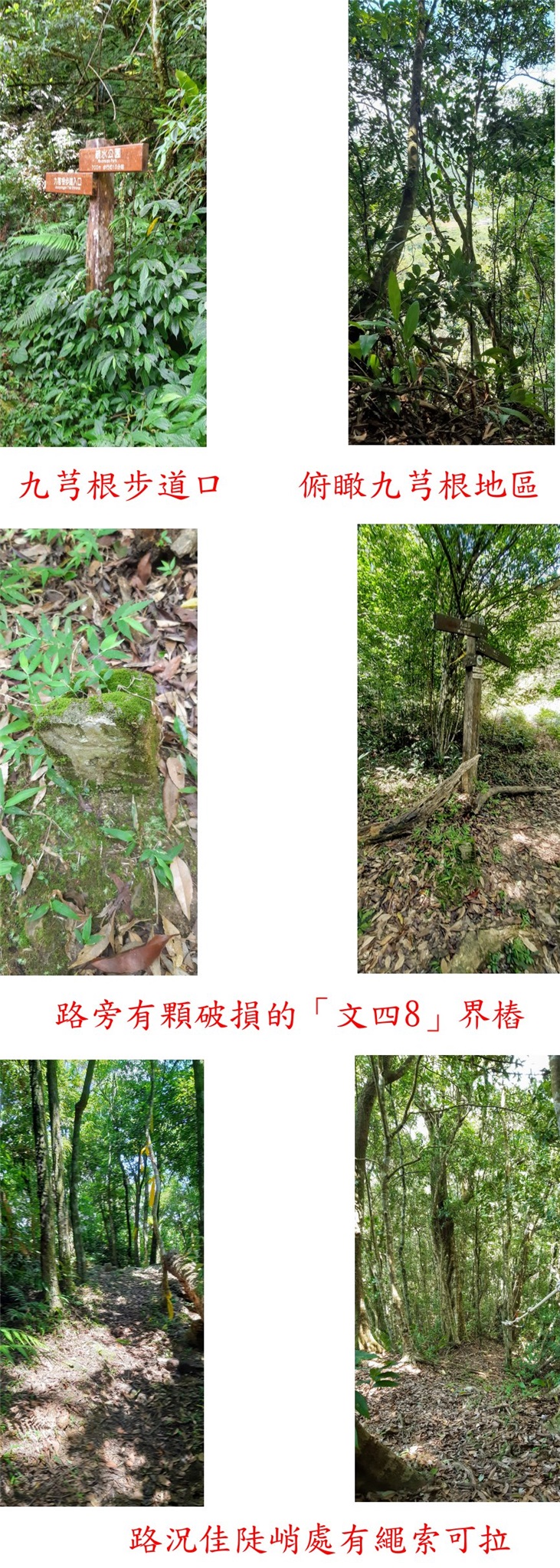 九芎根山續行山徑轉為緩上,路況佳的步道續走15分鐘至金紙崙叉路1,左往曾去過的金紙崙森林三角點;取直續走百公尺至