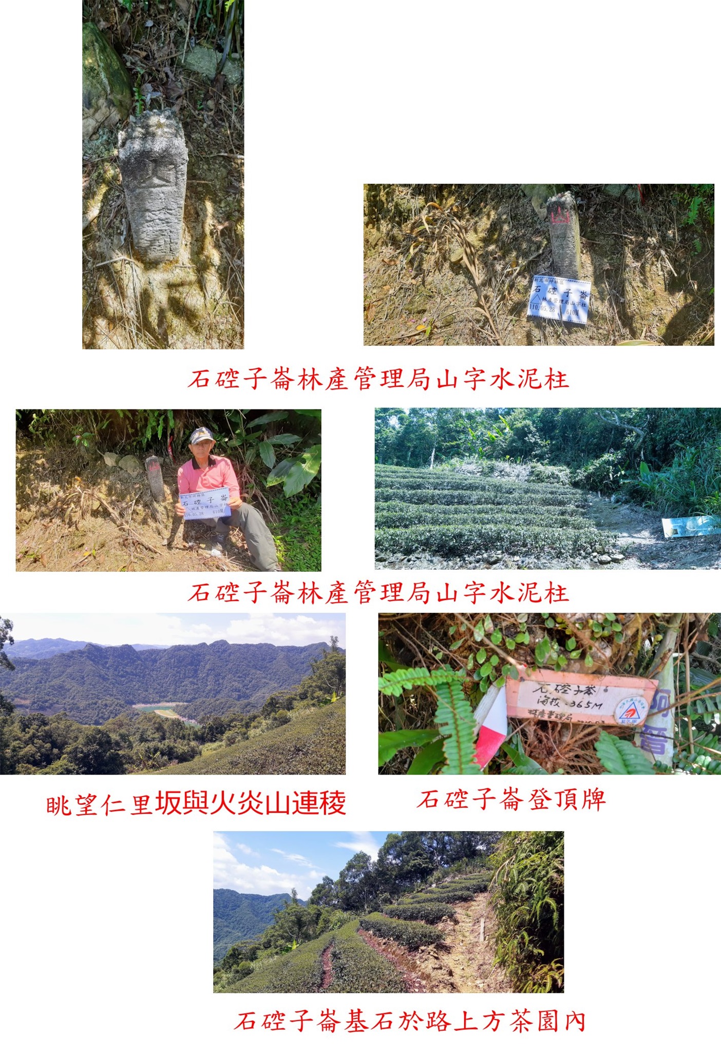 產道走約百公尺由1.25K由第3個茶園上切,於茶園上緣接小徑穿過樹林隨即進入第1個茶園,於茶園右上緣(道路上切茶園的右上緣)見到石硿子崙的林產管理局山字水泥柱;還有面登頂牌,林產管理局為林務局的前身,此點推估應埋在民國40年前後也頗有歷史,茶園視野佳,眺望仁里坂與火炎山連稜,俯瞰翡翠水庫集水區;走錯茶園上山走了7分鐘(正路只要2分鐘),此點往返費時15分鐘,上週曾來找過搞個大烏龍找錯座標。