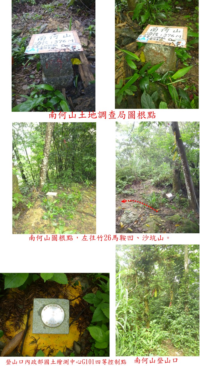 由二確山回至竹26線3.6K路口,右轉走0.55K,前轉為竹25線走約2.3K,停車於道路大轉彎處,於竹25線約6.15K處;右側有顆「內政部國土繪測中心G101四等控制點」,右入竹林山徑,路條多、路況不錯,走5分鐘抵竹林小山頭,路轉下坡,走10分鐘抵達南何山圖根點;基石於林間無展望,路左往竹26馬鞍凹、沙坑山,奇怪點位竟然誤差約80公尺?取直不明顯山徑探查,小山頭無基石;原路回至登山口,此山往返走40分。