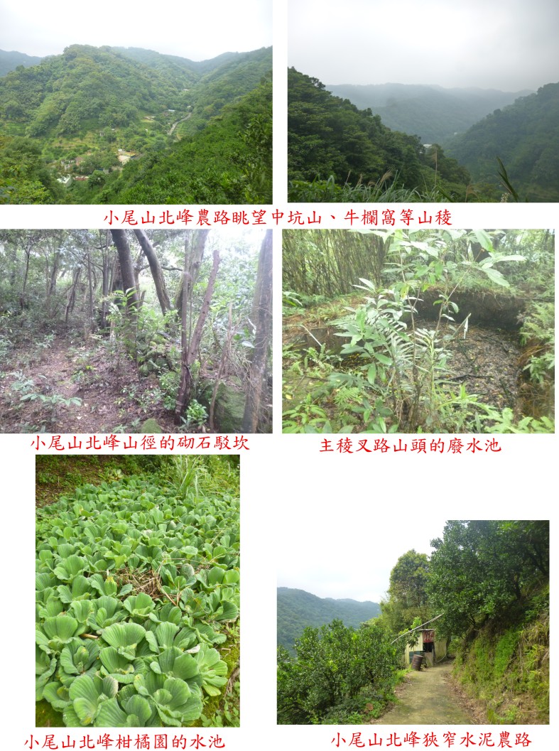 小尾山北峰有數個登山口,想由竹25線約8.4K南華橋叉路的農路上山,進入0.15K小農路上鎖放棄;另一登山口於竹26線4.1K處,由此線農路進入應為捷徑,當時不知未嘗試;另試著走五合宮後方農路上王爺坑山稜,農路狹窄放棄。