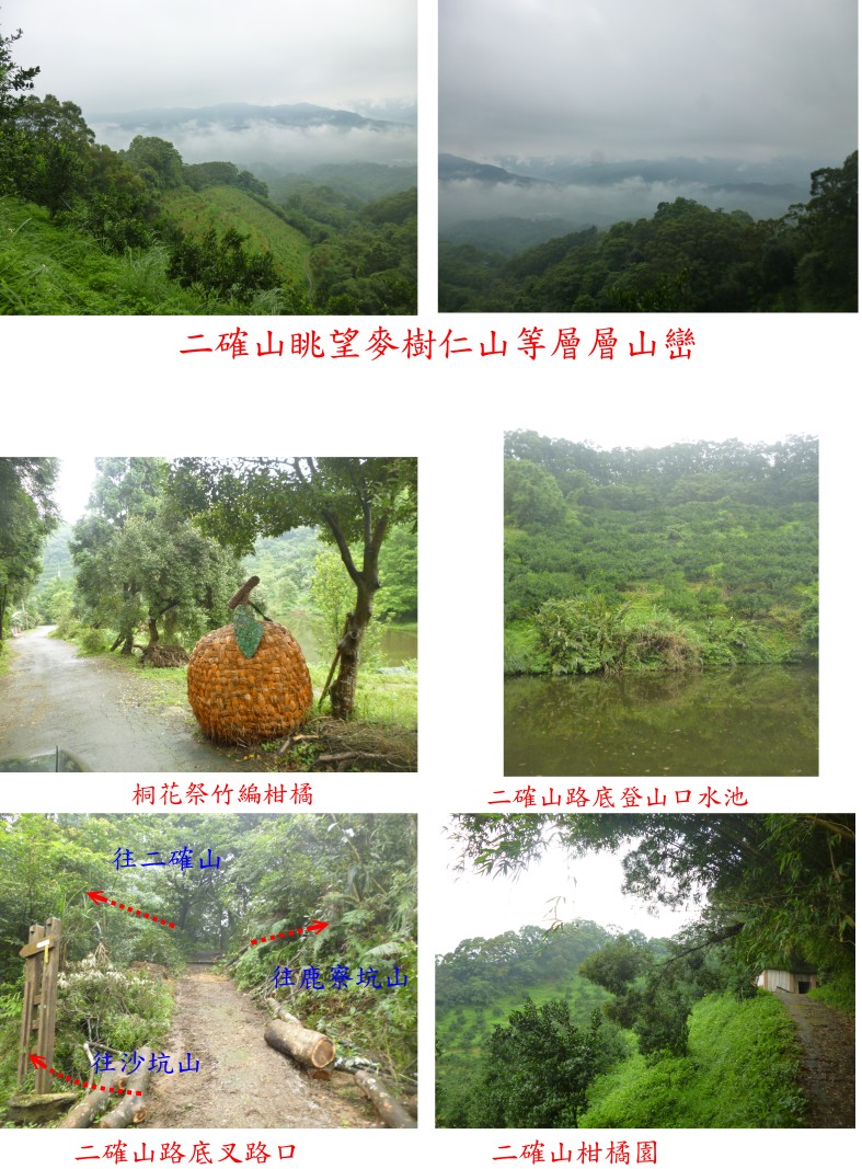 取土路走50公尺,土路左往沙坑山,取直走十餘公尺至稜線叉路,右往鹿寮坑山;取左山徑往二確山,走3分鐘進入柑橘園上方,眺望麥樹仁山等層層山巒;續行竟然找不到山徑,研究一下二確山基石於較低的支稜,取右陡下柑橘園,隨即接果園水泥小徑,至工寮接水泥路,前方左上支稜小山頭,隨即抵達二確山殖產局三角補點;於林內無展望,原路回至停車處,此山往返走24分。