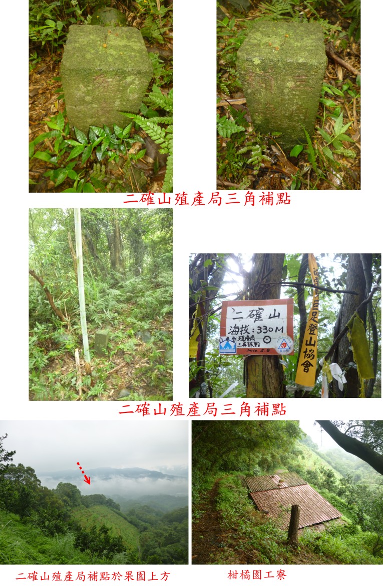 一、二確山:位於新竹縣橫山與芎林鄉交界處,標高320公尺,殖產局三角補點。