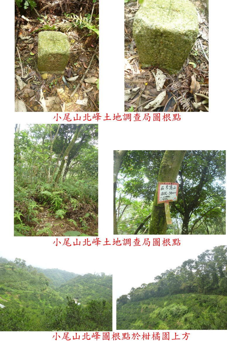 三、小尾山北峰:又稱茄苳窩山,位於新竹縣芎林鄉,標高380公尺,土地調查局圖根點。