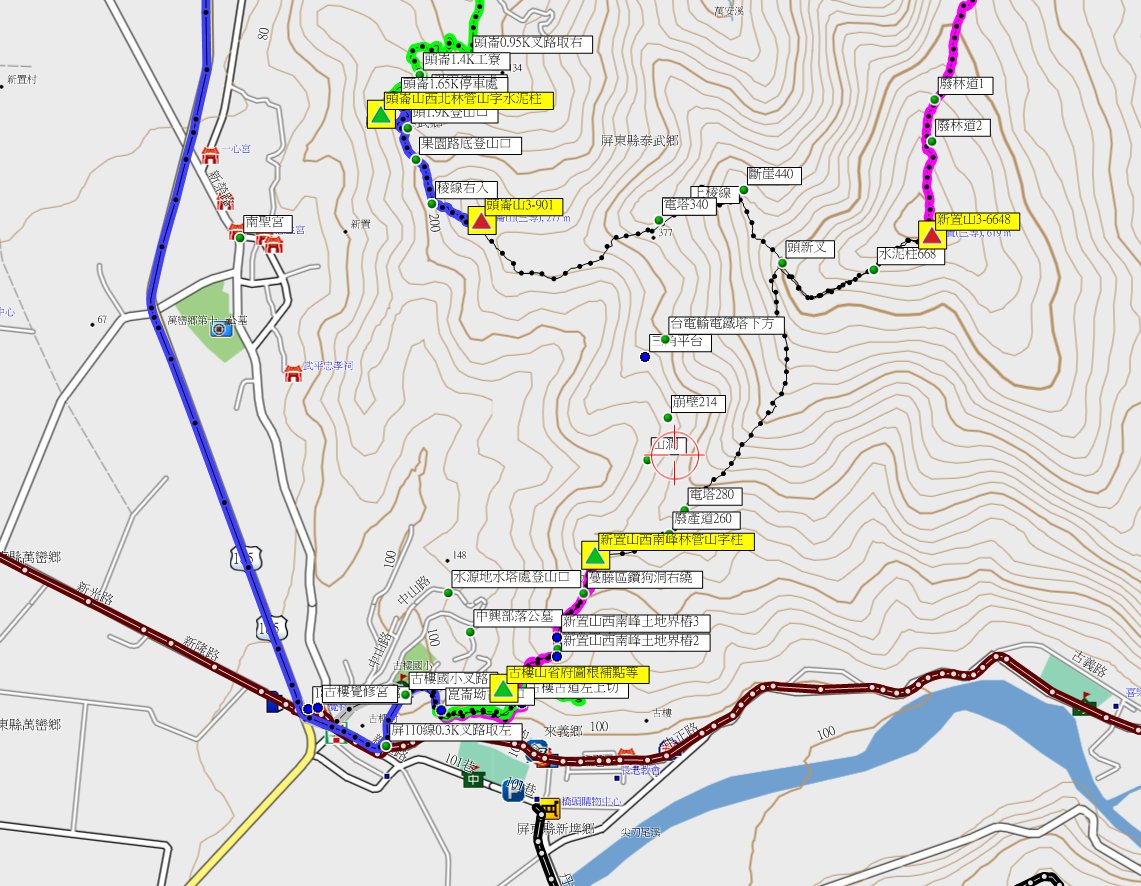 2、新置山西南峰:又稱新置山前峰,位於屏東縣來義鄉,標高282公尺,山林管理局55號山字水泥柱及保安林界水泥柱;座標211444 2492632。