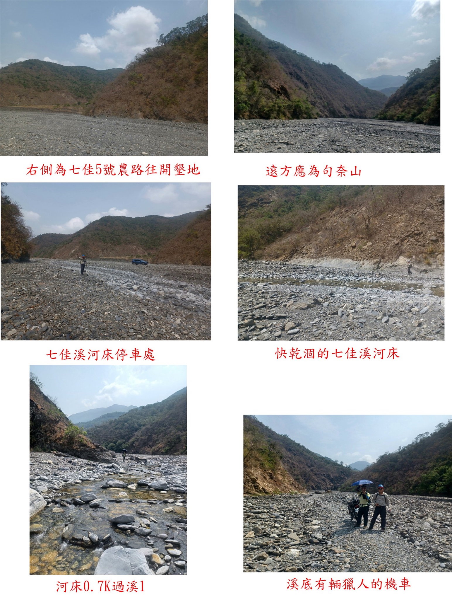 11:04七佳溪2.45K河床便道終點,以前機車還可續行,現河床切割出深溝已無法通行;再來有時走在乾涸的河床,有時走在乾河床的右岸或左岸。