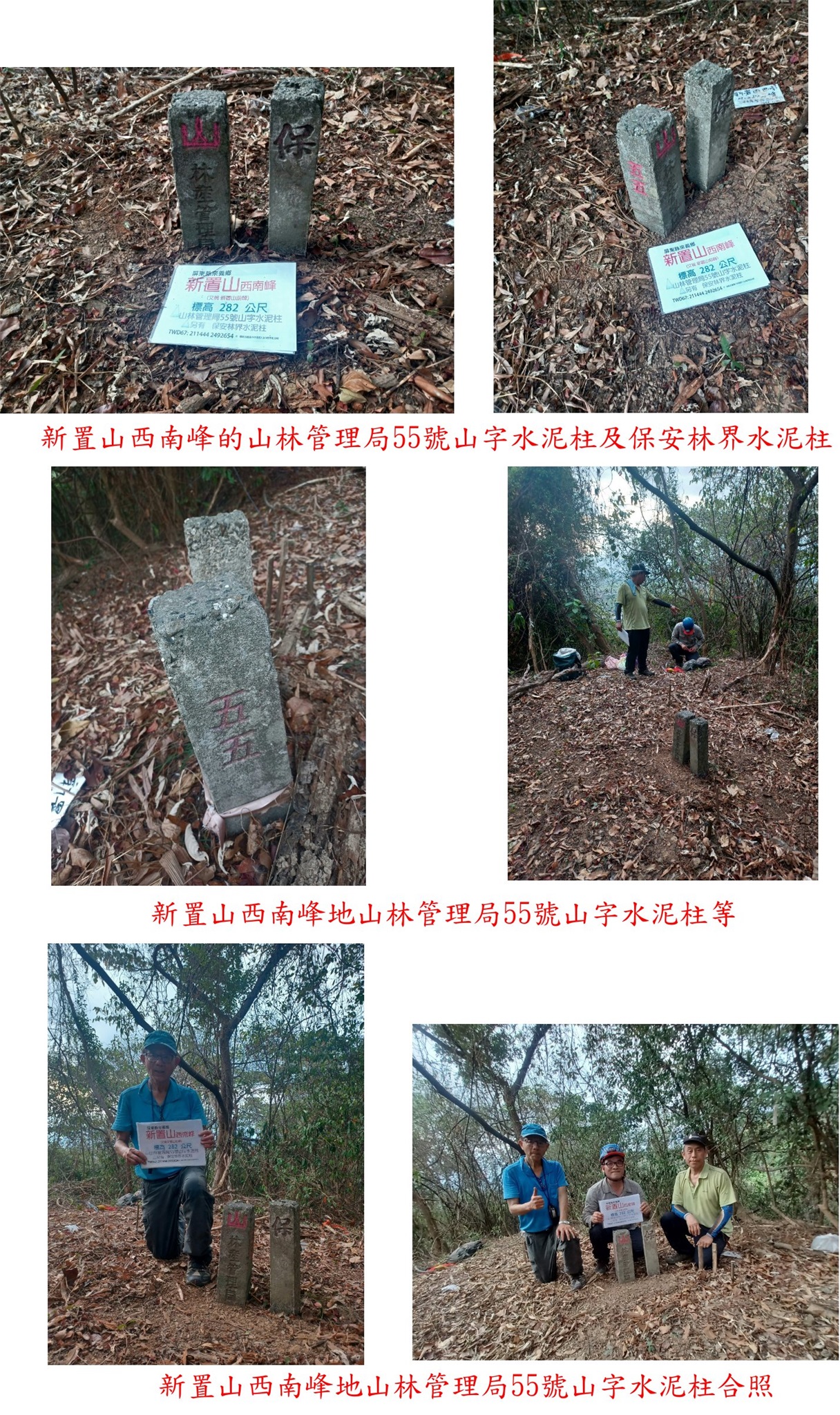 17:11△新置山西南峰,高282公尺,山林管理局55號山字水泥柱及保安林界水泥柱等;基石於倒木旁勇伯花點力氣清開,上山走52分鐘,續行山徑往新置山3-6648,但似乎不好搞。