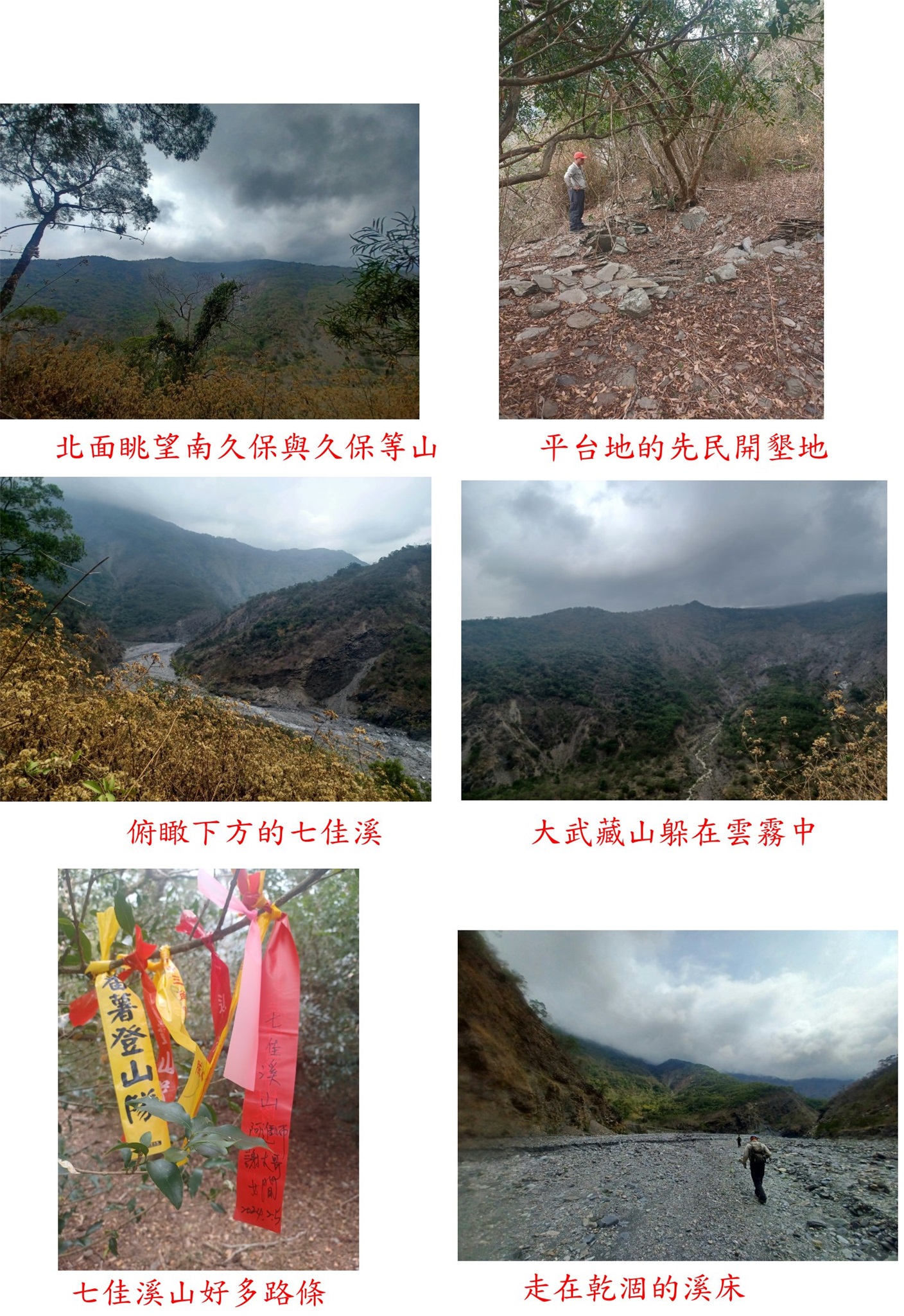 12:40△七佳溪山,高468公尺,補近28森林三角點,基石位於崖邊;此山舊時的路線係由老七佳走林道腰繞再下切,林道早已崩毀,如沒記錯溪底路線係阿明教授新闢,最近山友重新打通趕緊來撿便宜;上山走2小時又10分鐘,基石處北面眺望南久保與久保等山、大武藏山躲在雲霧中,俯瞰下方的七佳溪。