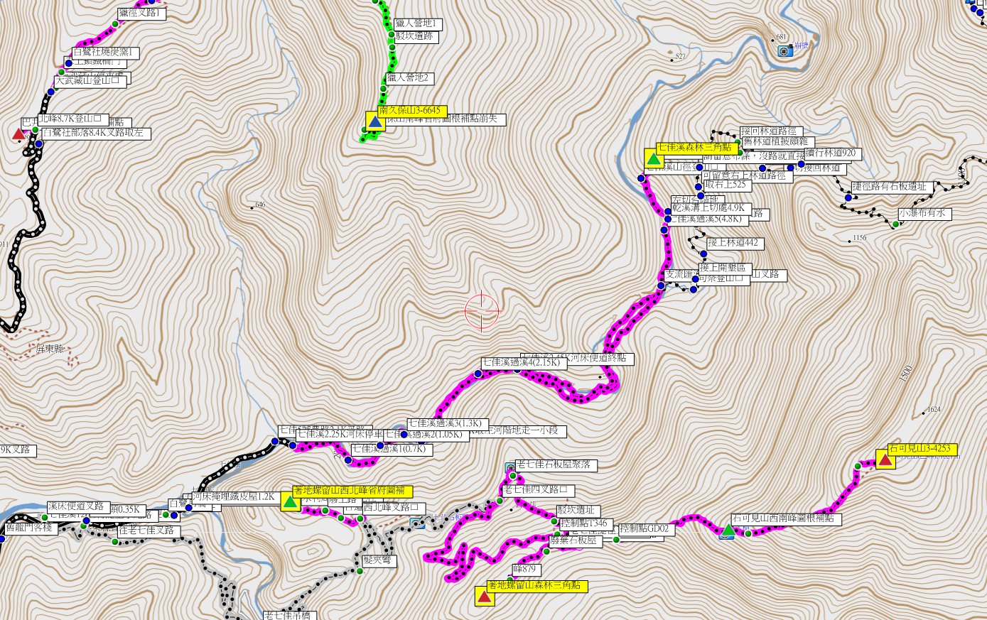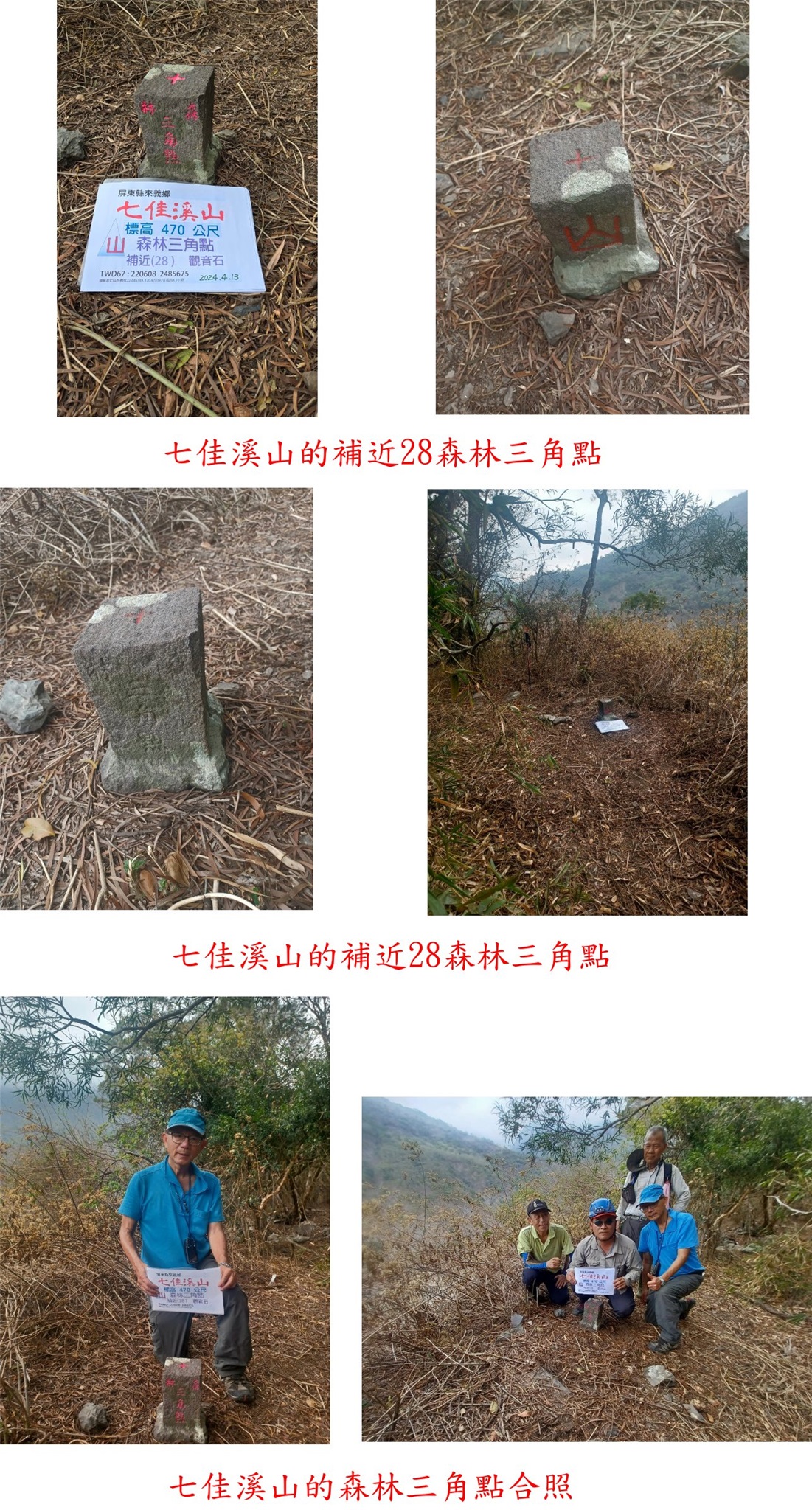 1、七佳溪山:位於屏東縣來義鄉,標高470公尺,補近28森林三角點;座標2206132485677。
