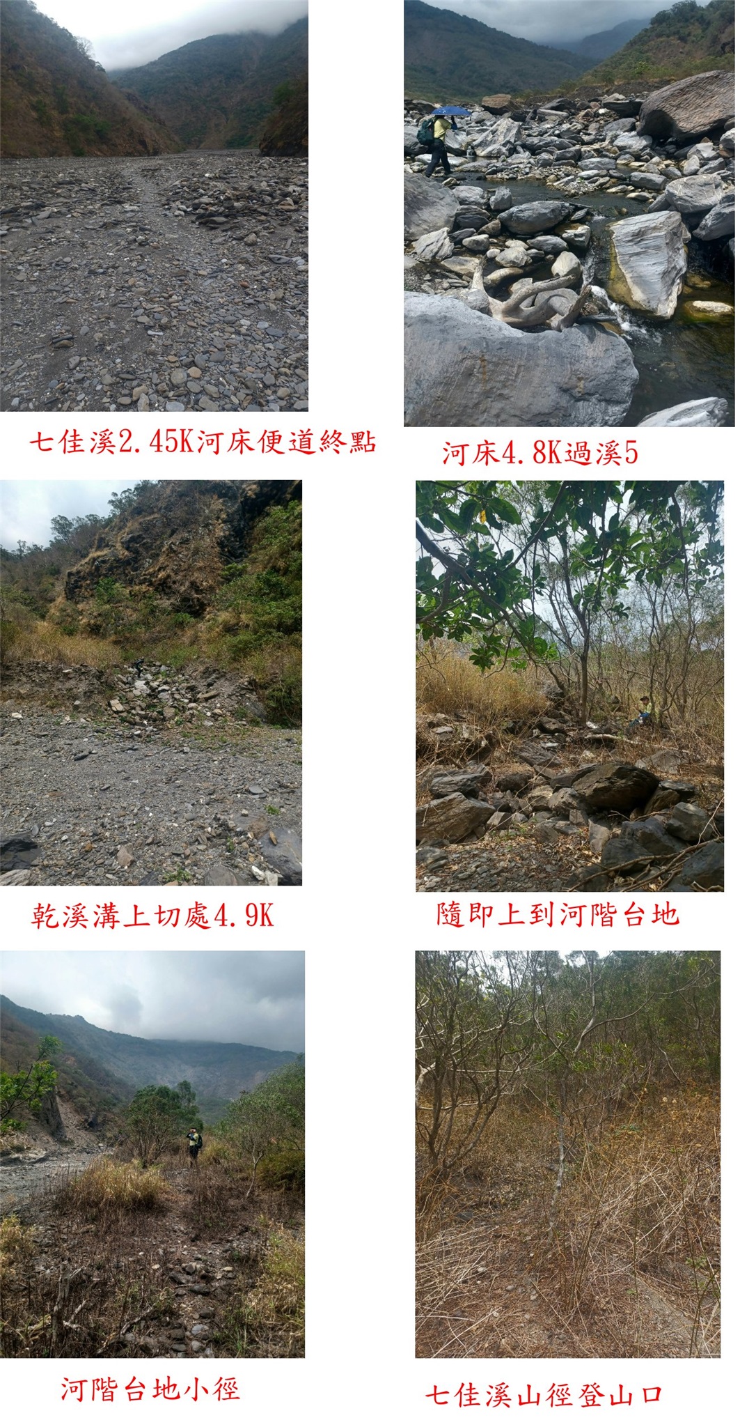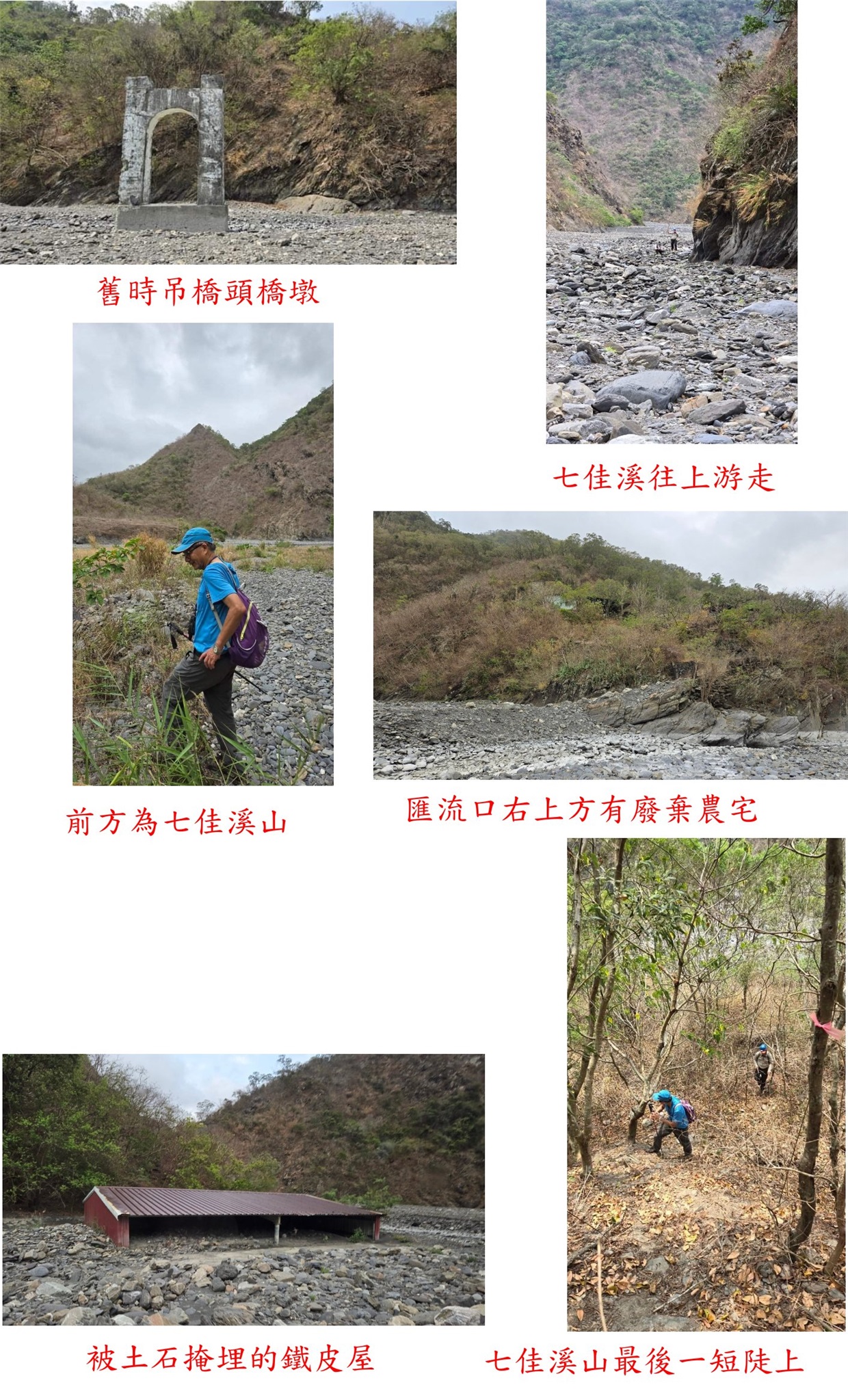 4/13早上台北走國道3號南下至霧峰接小楊、勇伯,續走國道3號南下至南州交流道下,接到台1線往南行至431.05K【0K】;左轉屏132線東行經力里部落至10K白鷺橋叉路,左過橋往舊白鷺部落不取,取直續行屏132線東行至12.5K叉路【0K】,直行往老七佳部落不取;取左下走河床便道走0.35K經舊時吊橋頭橋墩,續行至河床便道1.2K至力里溪、七佳溪匯流口,右上方有廢棄農宅,過匯流口有間被土石掩埋的鐵皮屋;續行至2.1K至另一支流匯流口叉路【0K】,左為七佳5號農路往開墾地,一般車輛建議停於此地,取路況差的河床續走約
