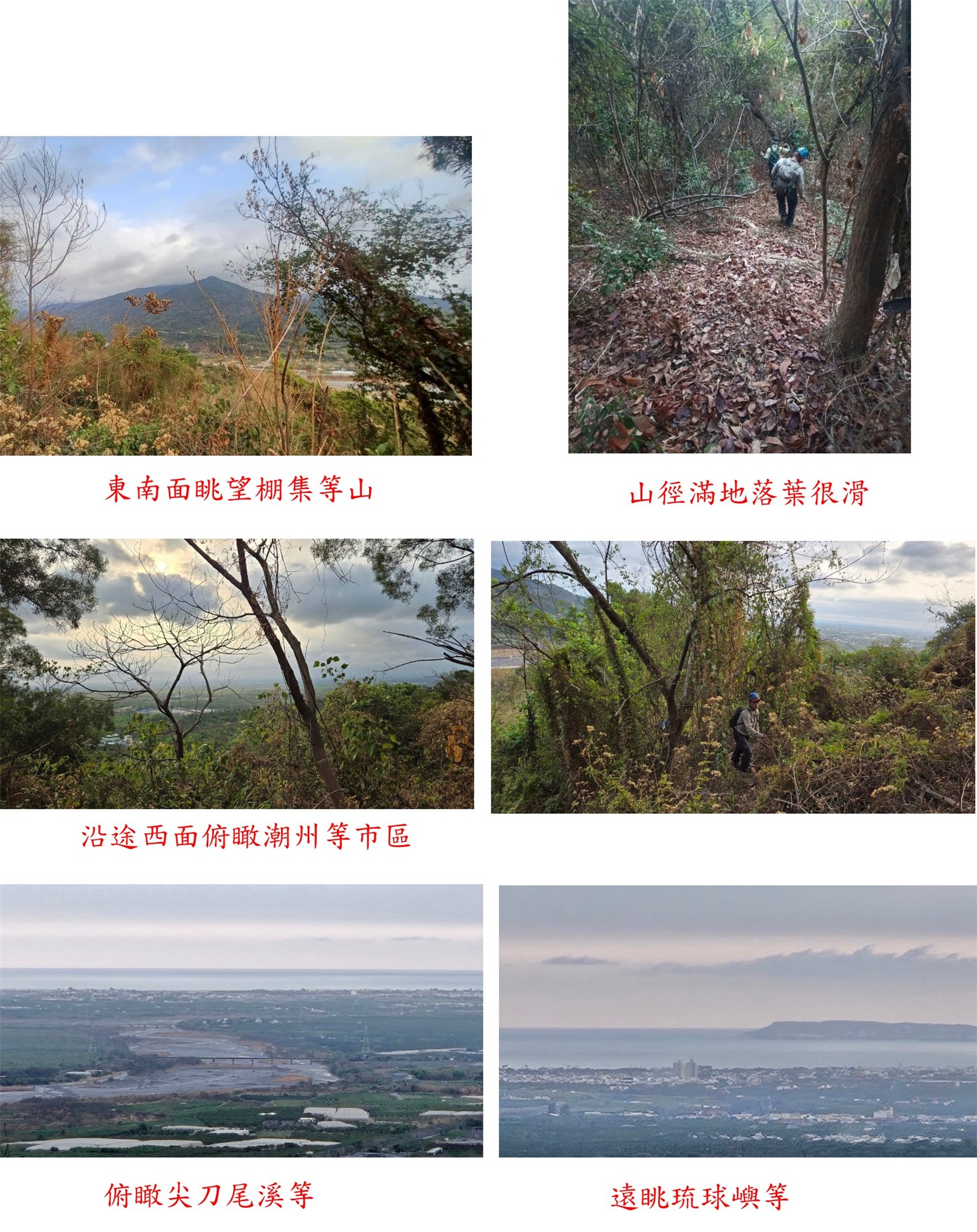 16:29古樓山稜線叉路,左往古樓山已去過省略;取右順稜行剛開始路況還不錯,有路條但滿地落葉很滑,沿途西面俯瞰潮州等市區、西南面俯瞰尖刀尾溪與大鵬灣等。