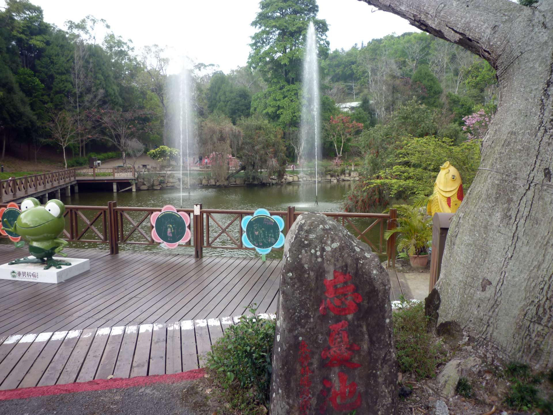 23東勢林場遊樂區內忘憂池,噴水白柱如萬頃千絲披垂