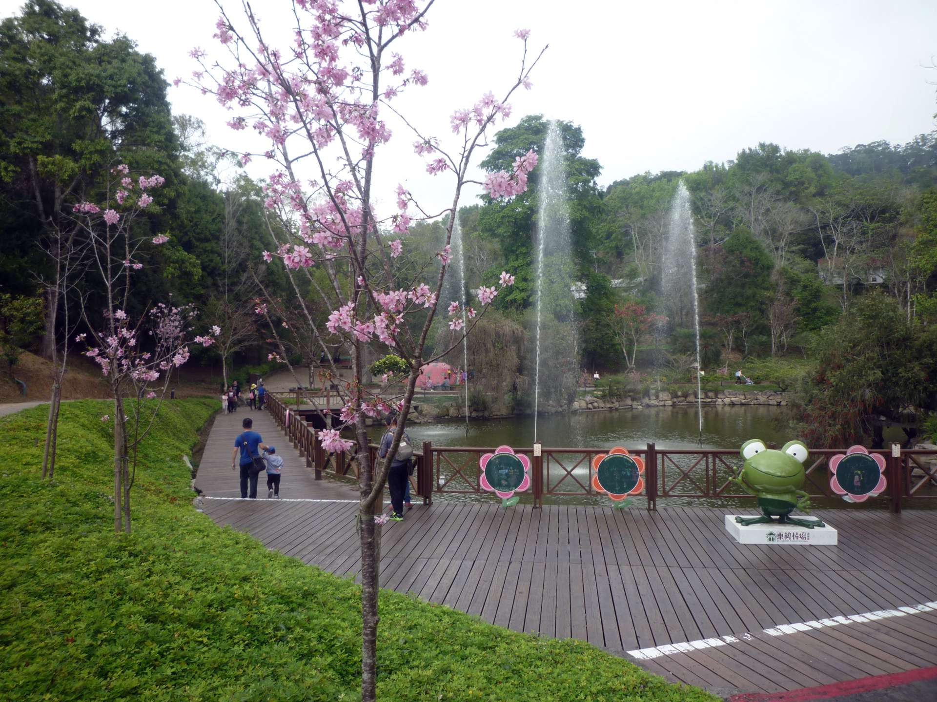 24東勢林場遊樂區內忘憂池,幾許櫻花綻開,增添池畔嫣紅蔚然