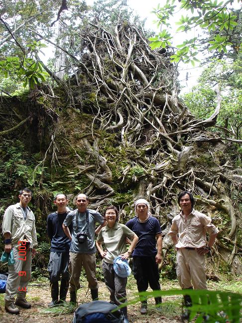 1110~1125 樹牆,兩棵巨木的根部沒有深入地層,只在地層表面糾結生長,經風吹雨打而倒下,露出糾結平坦的根部,猶如兩面牆壁,原本根部糾結生長的地方因巨木倒下,形成平坦的空地,照相、休息,因到巴博庫魯山還要陡上270公尺,如果選擇在此午餐,怕肚子太撐爬不上去,所以先以乾糧充飢,此地再拿出1000cc飲料與大夥分享
