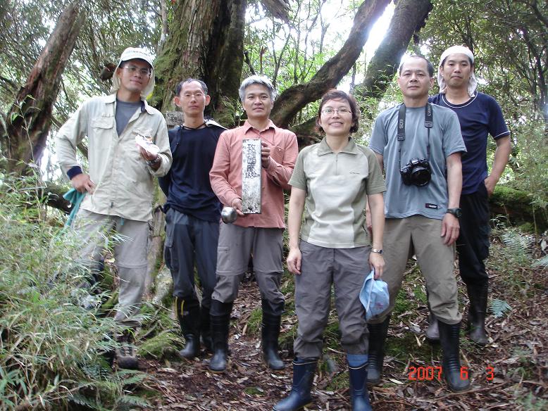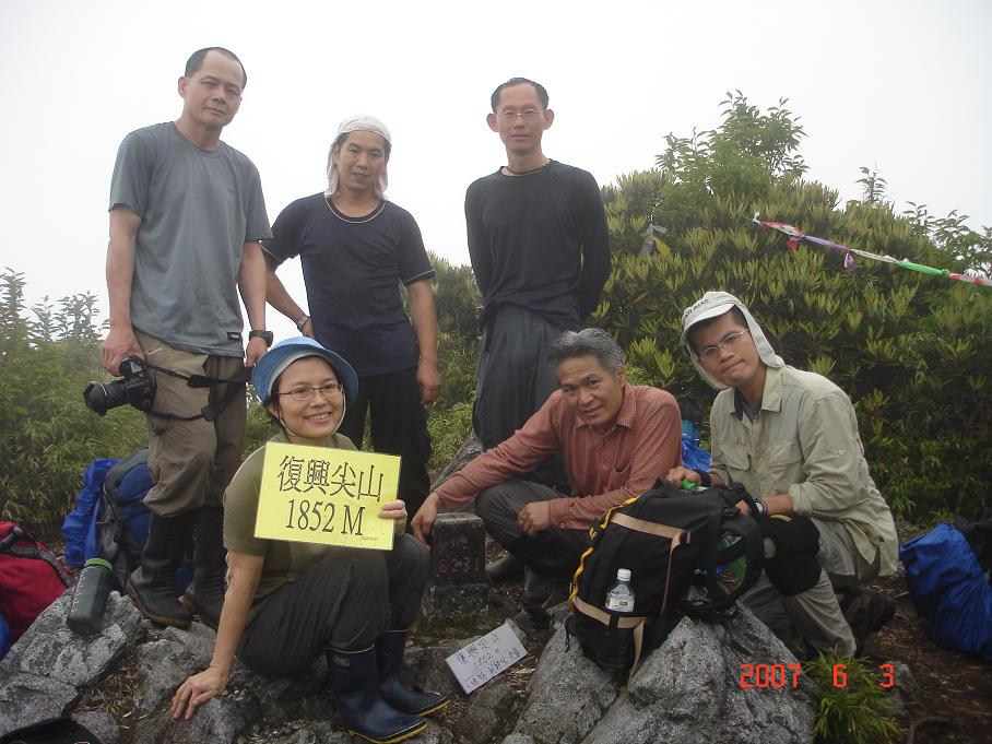 1710~1720 復興尖山(H1852m三等三角點No.6231),雨停了脫下雨衣,拍照留念後,又下起雨來,只好將脫下雨衣再度穿回,白毛拿出麵包及小蕃茄分給大家,補充體力後往登山口出發