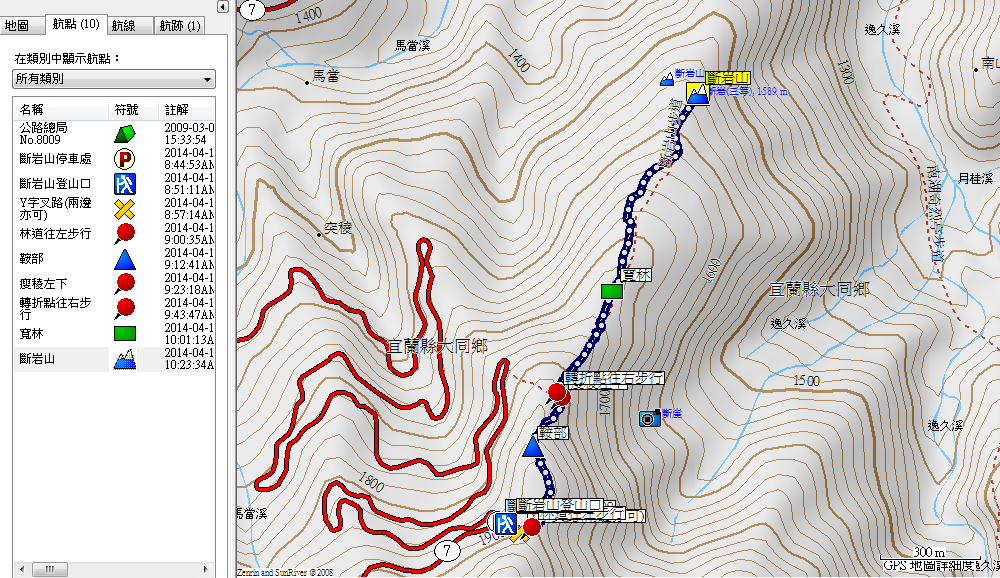 斷岩山:位於宜蘭縣大同鄉,海拔1589公尺,三等三角點No.6313,林中無展望,登山口在台7甲43.36K上稜處。2014/04-15