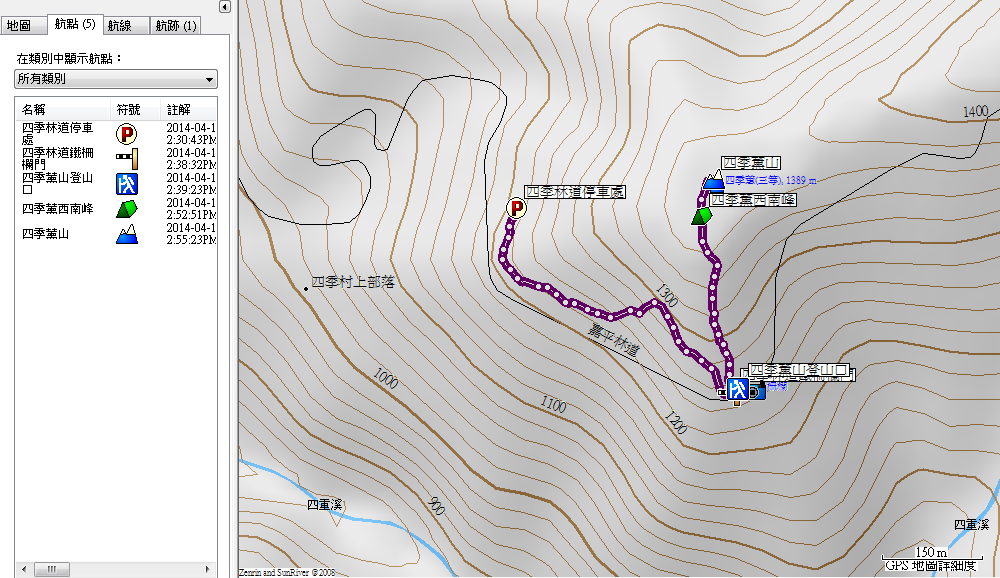 四季薰西南峰:位於宜蘭縣大同鄉四季村,海拔1389公尺,山字森林三角點,林中無展望,登山口在四季林道鐵柵欄門前方120公尺左邊上稜處。2014/04-15