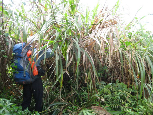 前段路徑只有幾處高過人頭又擋道的芒草才需拿刀開路,但愈到後面的路徑更是荒煙漫草一片,刀揮個不停,汗如雨下,由GPS判斷距離三角點只差一百多公尺,此時雷聲隆隆,忽晴忽雨的,於是決定撤離,天空也開始下起傾盆大雨了.